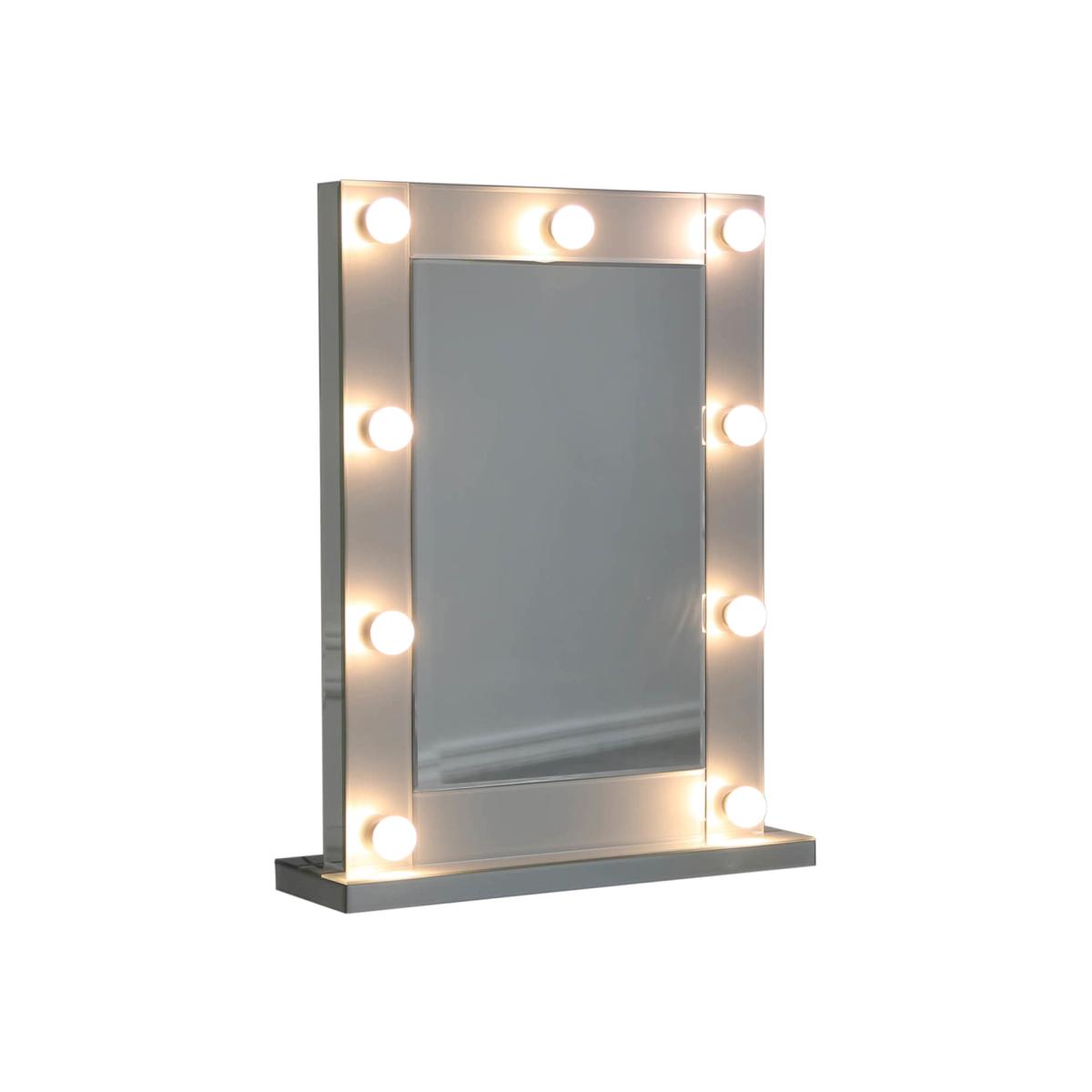 Dimensions H77 x W60 x D18 cm. Apply your makeup like a Hollywood celebrity. This beautiful mirror can simply be placed upon any surface in your desired room and features bevelled mirror edges and 9 bulbs which use an in-line dimmer switch so you can adjust the brightness to just how you like it whether that be ultra bright or a subtle glow. Features. 9 LED bulbs included with a light dimmable switch. Cable length 190 cm9 Bulbs included; type E14/ 2. W..