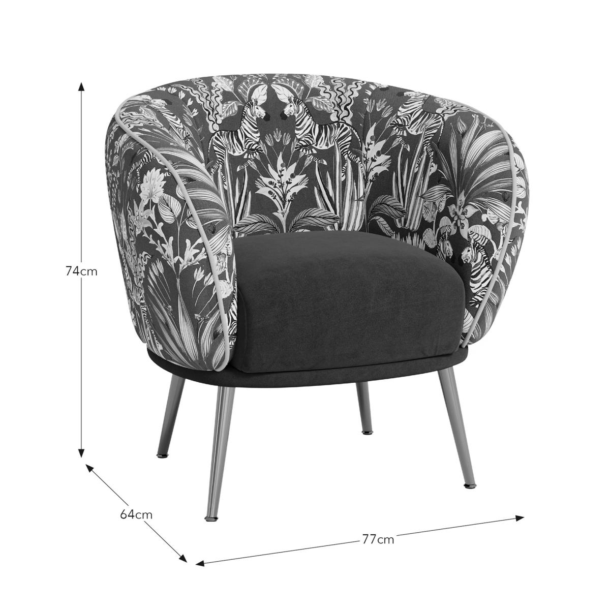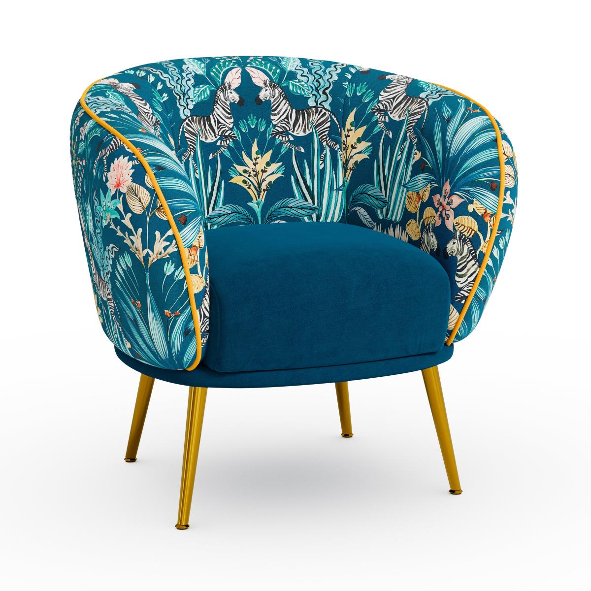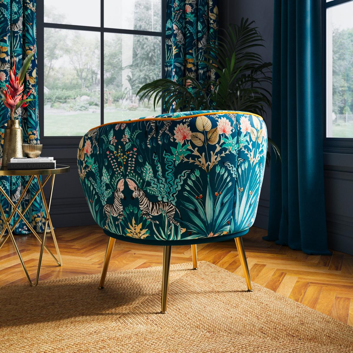 I’m a fan of the Bella chair for its neat, rounded shape and bold tropical print - it instantly lifts a neutral scheme without feeling over-the-top. The teal velvet seat and brushed gold legs suit contemporary lounges or an eclectic home office, especially against soft grey or muted stone walls. For styling, balance the pattern with plain cushions in complimentary shades (think deep ochre or forest green) and add a simple brass-trimmed side table to echo the leg finish. A woven jute rug beneath will ground the look and introduce extra texture, making the chair a versatile focal point rather than just an occasional piece.