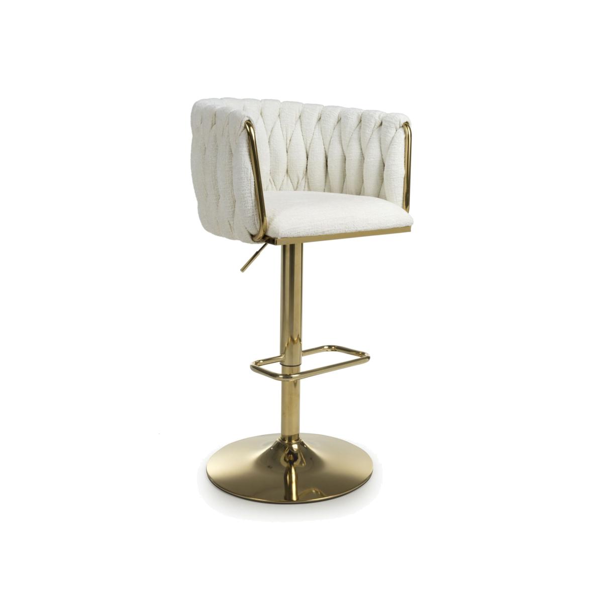 A beautifully woven bar stool on a stunning gold base. The textured upholstery is threaded around the semi circular gold backrest frame, to create the ultimate in elegance. Comfortable high supported armrests and a padded seat complete the decadent look. A gas lift mechanism adjusts the stool height from 85cm to 107cm via an under seat handle. The seat also easily swivels a full 360 degrees. Assembly required. Sold individually.