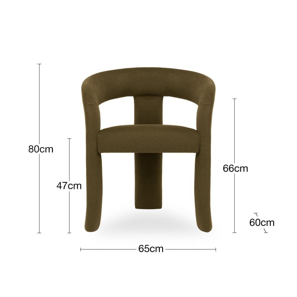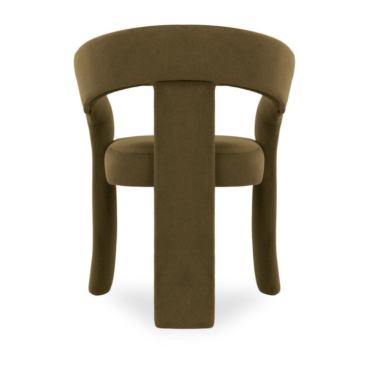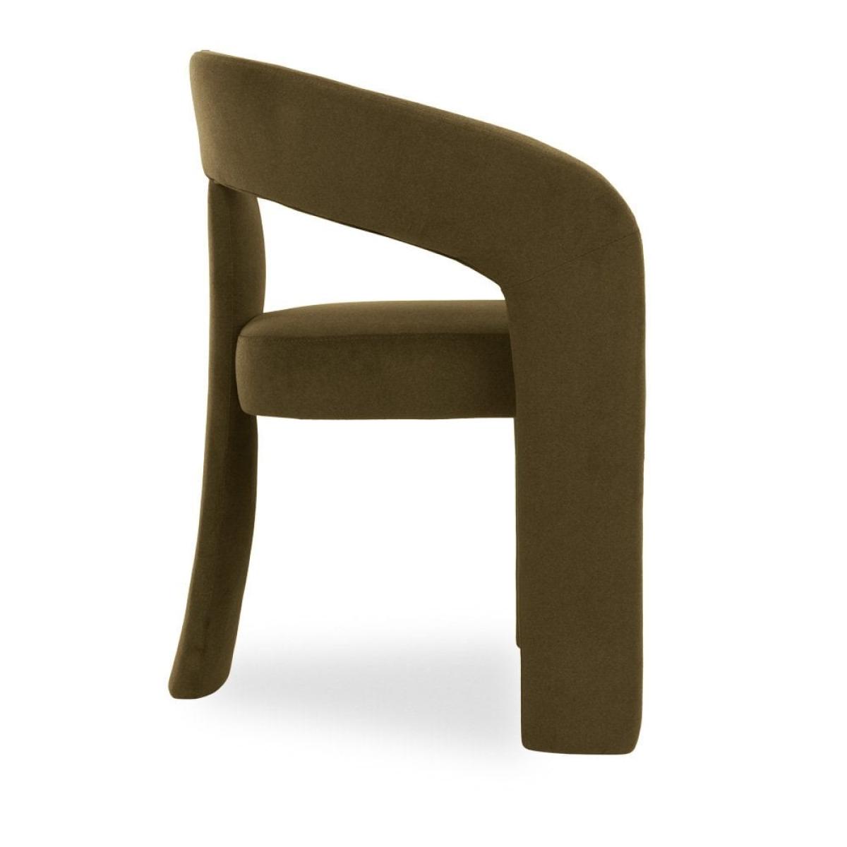 I’m a fan of this moss-green velvet dining chair for its blend of sculptural form and eco-friendly mohair fabric - it feels both durable and tactile without overwhelming a space. Its rounded back and open-frame sides suit contemporary, mid-century or even Scandi-inspired rooms, pairing especially well with light timber tables or matte black metal legs for contrast. For styling, use it as an occasional desk chair in a home study or around a simple round table in a city apartment. Accent with brass-tone lighting or a low-pile jute rug to balance the plush velvet, and keep surrounding décor in muted neutrals so the green upholstery remains the focal point.
