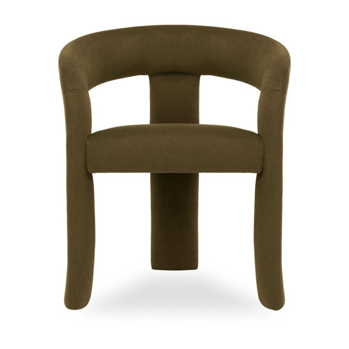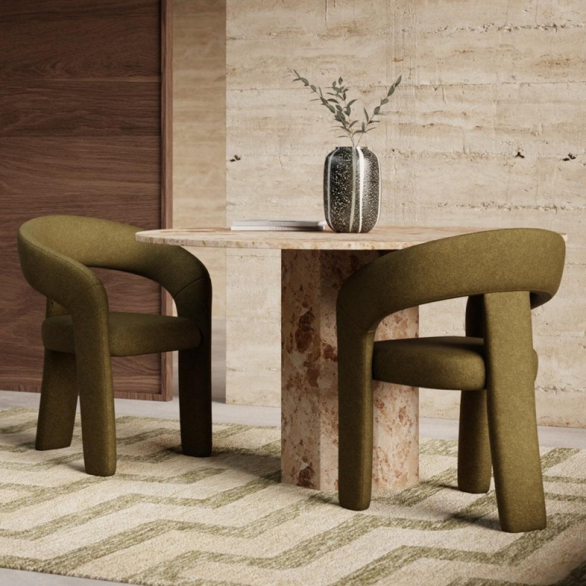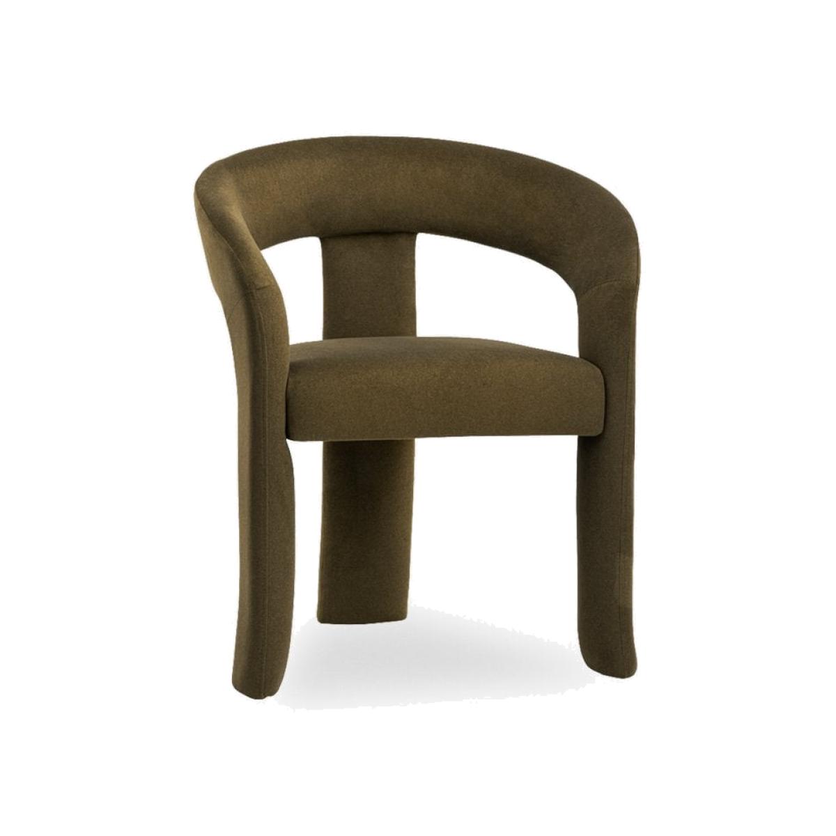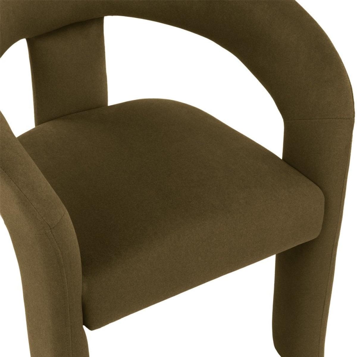 I’m a fan of this moss-green velvet dining chair for its blend of sculptural form and eco-friendly mohair fabric - it feels both durable and tactile without overwhelming a space. Its rounded back and open-frame sides suit contemporary, mid-century or even Scandi-inspired rooms, pairing especially well with light timber tables or matte black metal legs for contrast. For styling, use it as an occasional desk chair in a home study or around a simple round table in a city apartment. Accent with brass-tone lighting or a low-pile jute rug to balance the plush velvet, and keep surrounding décor in muted neutrals so the green upholstery remains the focal point.