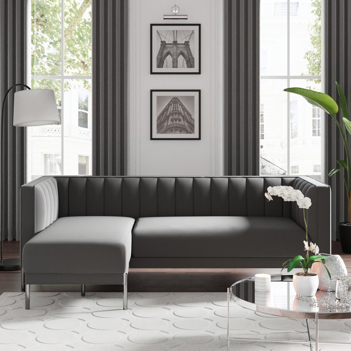 Modern and sophisticated, the Bellamy corner chaise sofa is designed with clean lines and elegant details. This sofa is upholstered in a beautiful soft touch velvet fabric with a pleated back and armrests finished with a subtle piped edge detail. Metal legs make this sofa stand out from the rest with an edgy contemporary flair. All these elements together makes the Bellamy the perfect statement piece for your living room. This sofa is as luxuriously comfortable as it is stylish, complete with deep padded foam seats and backrest for ultimate comfort and support. Did you know, we now offer a 10 year frame guarantee on this sofa. To find out more, please. To check out our handy sizing guide to help you find out if you’ll be able to get your new furniture into your home. Need to throw out your old sofa first? View our information on. Furniture recycling and collections.