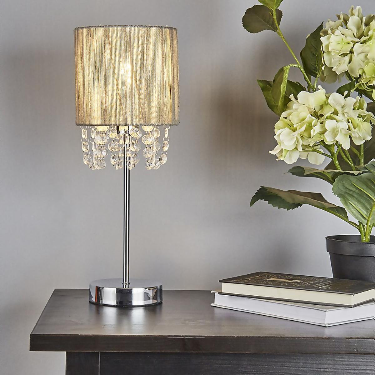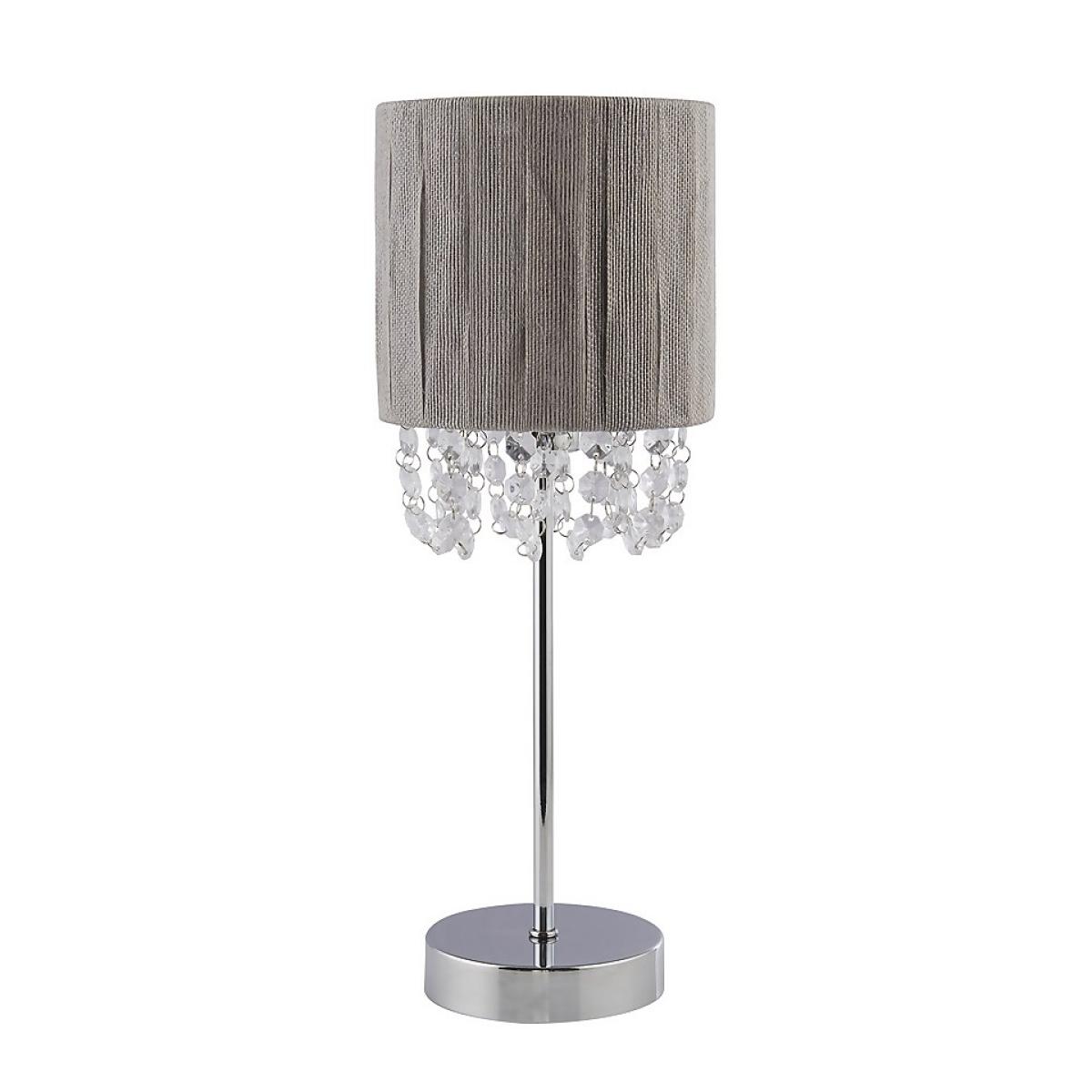 Glamorous and luxurious, the Bellano table lamp will add instant elegance to any living area, or equally can be used on bedside tables. With a grey fabric shade with hanging acrylic droplets, this table lamp will be a stunning addition to any home.