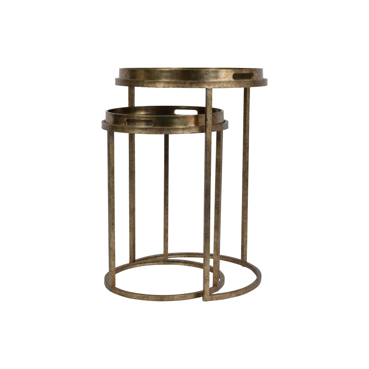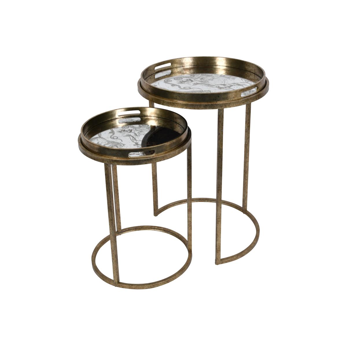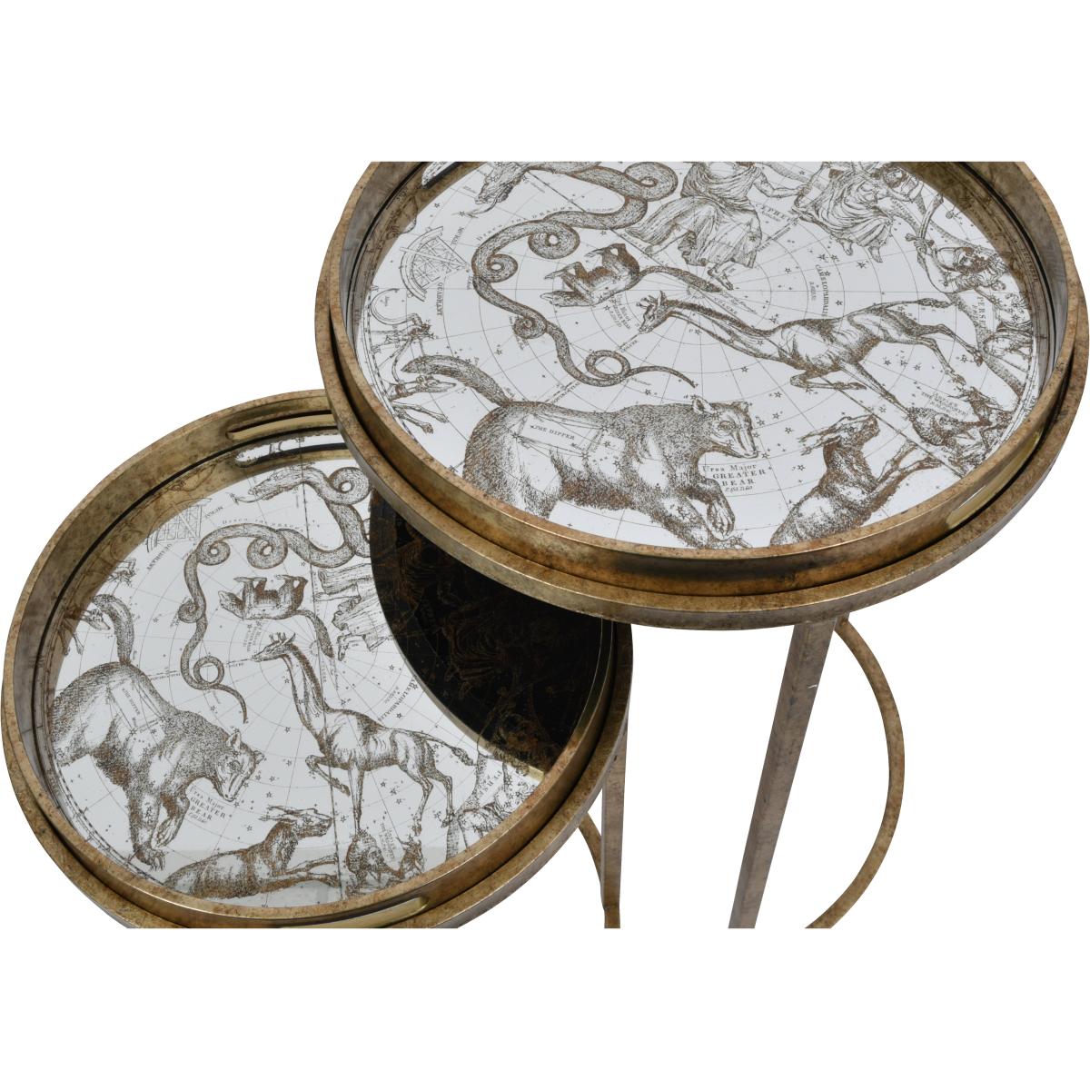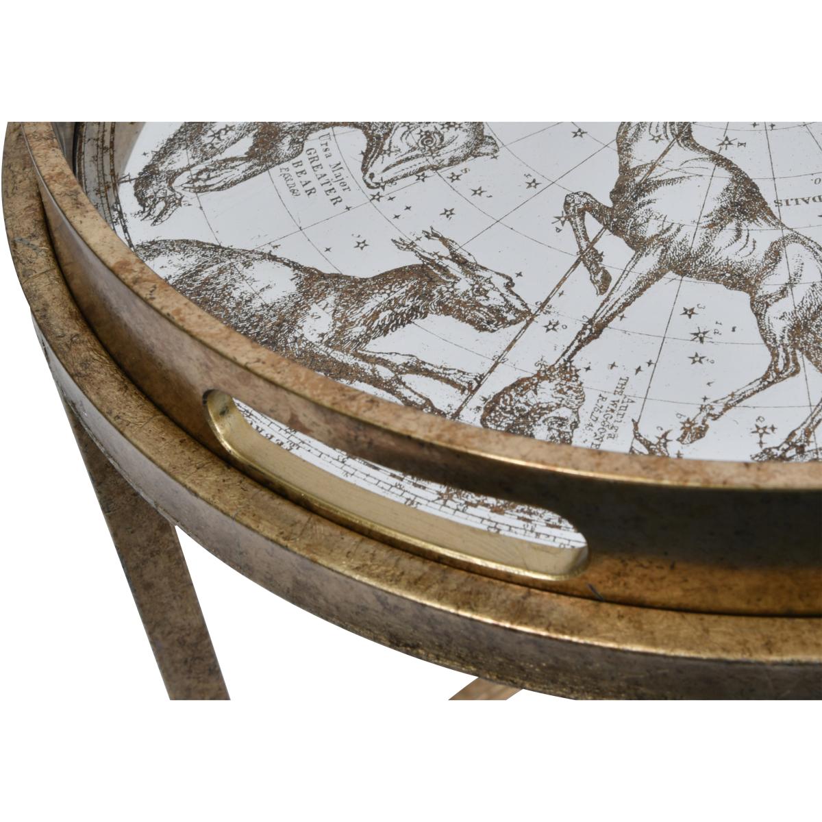 Stars in your eyes? This stylish duo boasts ornate surfaces of zodiac constellations paired with a distressed gold trim. Perfect for serving drinks or late night snacks. Why you'll love it Invite the night sky into your home with these unique side tables. Distressed gold finish oozes vintage glam charm. Ideal for dinner parties and stylish soirees. Tables nest together so you can store them away neatly. Trays are removable for hassle-free serving. This side table is part of the Furniture Village table collection. What you need to know Do not use abrasive cleaning products. Wipe clean with a damp cloth and dry with a soft duster. We recommend using placemats and coasters at all times.