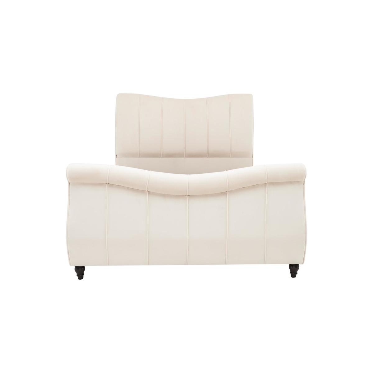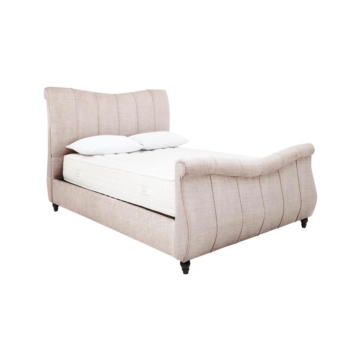Headboard and Footboard each come as one single piece. You’ll feel like a princess – or a prince – in the beautiful Belle bedframe. The ultimate in luxury, this opulent sleigh-style bedframe surrounds you in luxuriously padded and embellished style. Gorgeously curved and luxuriously padded, the high headboard and lower footboard have romantic scroll ends and are embellished with parallel rows of stitching, a bold designer detail. Choose from a wide range of luxury fabrics including velvets and wools as well as plush and woven textiles and in beautiful neutrals, bights and bolds. The frame is handcrafted and each bedframe is upholstered by hand. Available in double, king and super king sizes, this bedframe accommodates any kind of mattress. Made in Britain, the Belle bedframe is the perfect centrepiece for your beautiful and romantic bedroom. Mattress available separately