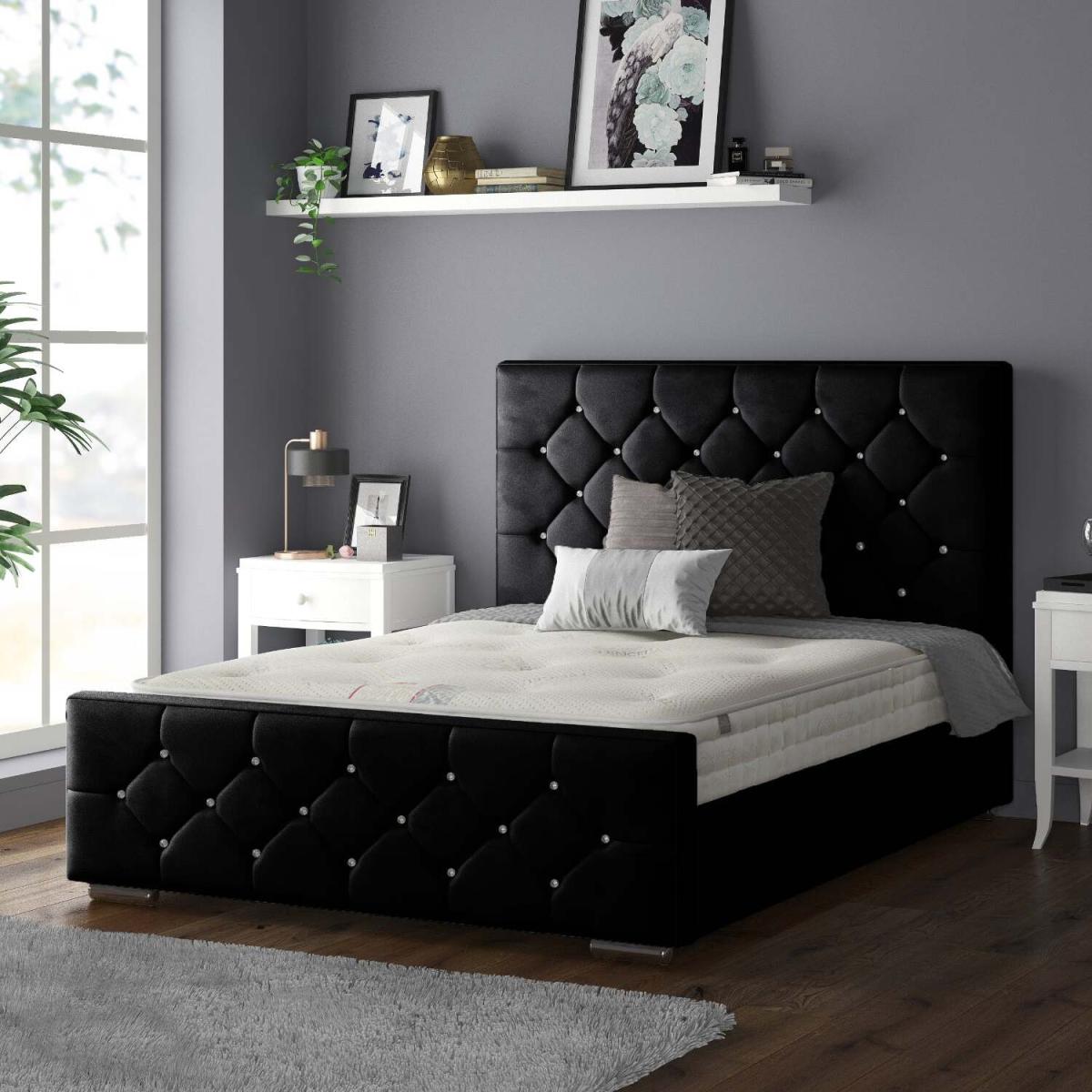 I love this black velvet bed frame with diamonds for its luxe yet versatile look, making it a perfect centrepiece in both modern and glam interiors. The plush velvet finish adds a touch of softness and elegance, while the diamond detailing creates subtle visual interest without overwhelming the space. It works particularly well in monochrome or muted colour schemes, serving as a dramatic anchor, but can also be paired with metallic accents for a sophisticated edge. Practical styling tips include keeping bedding simple and sleek to let the bed’s detailing shine, and adding textured cushions or throws in contrasting fabrics for extra depth. This frame continues to look stylish and polished, whether used in a restful bedroom retreat or a stylish guest room.
