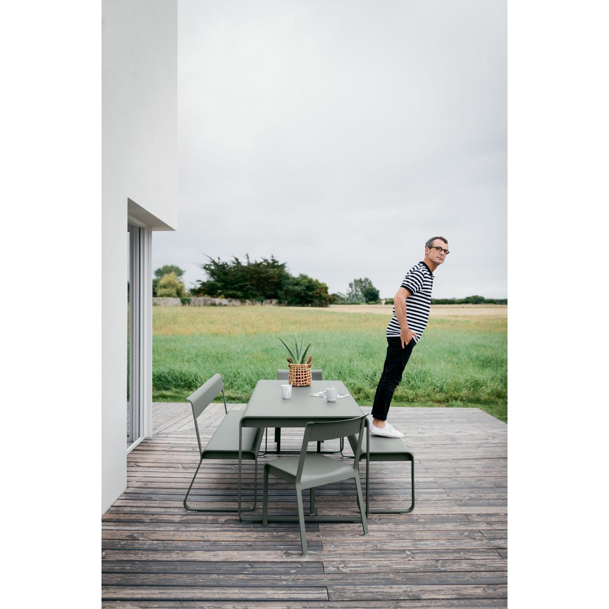 Count on togetherness with Bellevie! This large aluminium bench with backrest (L 161cm) can accommodate 4 people: the ideal accompaniment for large family tables, both inside and outdoors. Very light and stable, it forms a wonderful set with the Bellevie table. Combination of aluminium and steel, to optimise handling and stability, this new bench will also find its place on its own, in a garden or on a terrace. The Bellevie bench with backrest is available in a variety of jolly and vibrant colours.