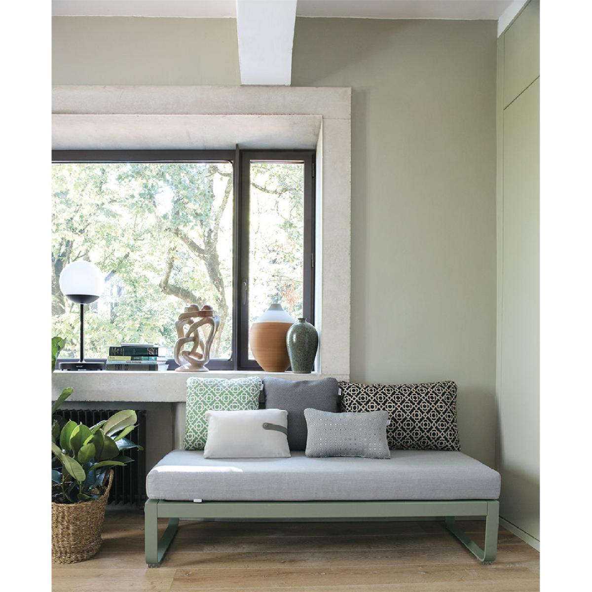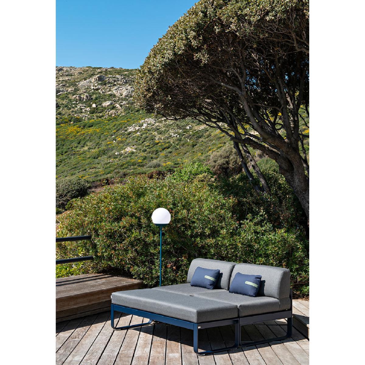 The Bellevie collection and all its curves as created by the Pagnon et Pelhaître design studio features a backless bench - a unique option in this large collection which is at home in the lounge as much as the dining room. For an easy to use and pretty look. Try this cute bench! Practical, it can be configured many different ways - Make up a bed by attaching your bench to the Bellevie 2-seater sofa as a footrest. Or combine it with an armchair or sofa from the same collection. Also, place them around a coffee table for a matching lounge set. But the Bellevie bench also works very well on its own, both indoors and outdoors - imagine this bench without a backrest - leaning against a wall in your hall and filled with decorative cushions - nice and practical when putting on your shoes! Its comfortable seat owes its high durability to polyurethane foam padding and guarantees constant support over the years. And the softness of the Sunbrella® fabric tempts you to sit for hours on end. With two or three people, anything goes! The cushion covers are very easy to care for and can be machine-washed if necessary. What’s more, there's no need to bring your cushions in, unless heavy weather is forecast. They can spend the whole of the summer outside because they are not afraid of the rain or UV rays! As for the metal structure of this ingenious bench, it is extremely solid. That’s no surprise! It benefits from Fermob’s renowned savoir-faire. Long live the large Bellevie family whose furniture comes in a wide range of colours.