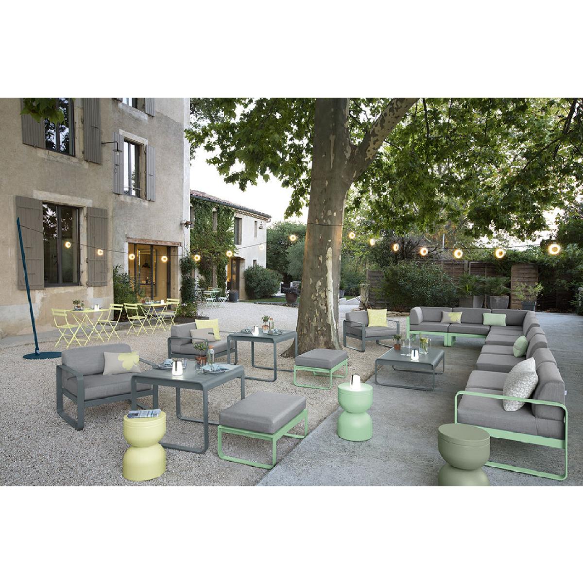 A pouffe in the Bellevie collection from the design studio Pagnon et Pelhaître? How pretty it is! With its simple lines and timeless look, this collection moves with the rhythm of garden life. A pouffe. And poof! You can sit here or there. It can be moved to join the circle of guests who are comfortably seated around Bellevie furniture. Or, on the other hand, your can grab a bit of solitude. Lean against a wall and read a book. How practical! Indoors or outdoors, the Bellevie pouffe will rise to every occasion! Its lightweight design makes it so easy to move around. For a stylish chaise longue, add your pouffe to a Bellevie armchair or sofa! The Bellevie pouffe is, in fact, an ideal footrest! The easy care cushion cover is fantastic - 100% acrylic, treated against stains and mildew, it is machine washable if necessary. And what about the soft touch of its Sunbrella® fabric? Your stylish footstool’s foam seat is both firm and comfortable, keeping its softness over the years. It is not affected by bad weather too and you can always detach the cushion in case of a heavy storm! This beautiful piece of furniture is made in France and surprisingly hard-wearing - The polyester powder paint on its metal structure never fades. The clever Bellevie pouffe can be used as a seat as well as an occasional table by removing its cushion The frame comes in 24 colours and the cushion fabric in three colours. What are you waiting for? Fall in love with a pouffe that will be a wonderful addition to your Bellevie lounge set! Check out the rest of the collection and complete your garden furniture set with a beautiful three seater sofa and/or a coffee table!.