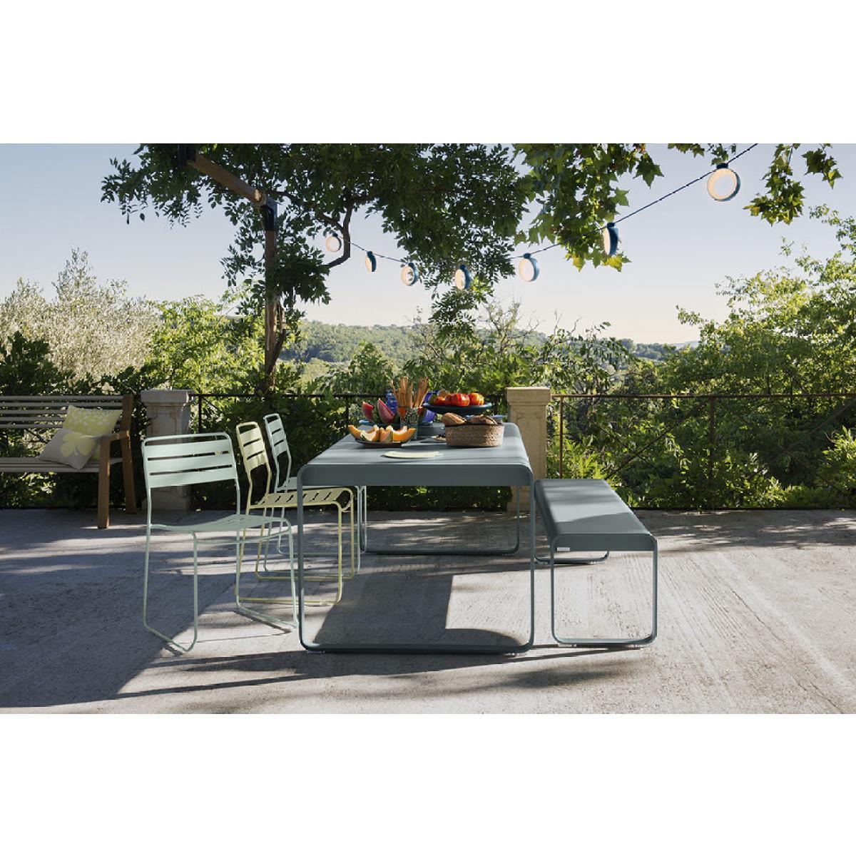 Count on conviviality with Bellevie! The Bellevie bench is available as a Premium version designed exclusively for intensive use (contractors, public authorities, restaurants and hotels). Its stability has been reinforced with rigid crossbars and a drilled base that can fix the bench to the floor. A very stable flat-base garden bench with design in perfect harmony with the Bellevie table. It can accommodate up to four people as they come and go. It is made of a clever mixture of steel and aluminium, giving it lightness and strength. With its geometric shapes and timeless curves, it can stand alone as a place for welcoming people onto the patio or be used with the Bellevie table, just like the bench with backrest and the chair from the same collection.