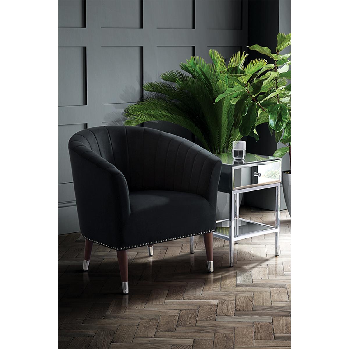 A striking statement chair which references the luxurious Art Deco era. Upholstered in rich velvet fabric. Comfortable sprung base. Compact design, ideal for use in bedrooms, conservatories, lobby areas, bars and restaurants. Skilfully upholstered fluted backrest. Handsome chrome upholstery tacks and ferrules. Five minute assembly, simply attach the legs.