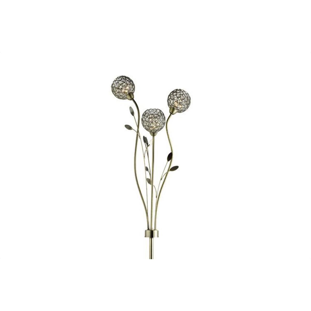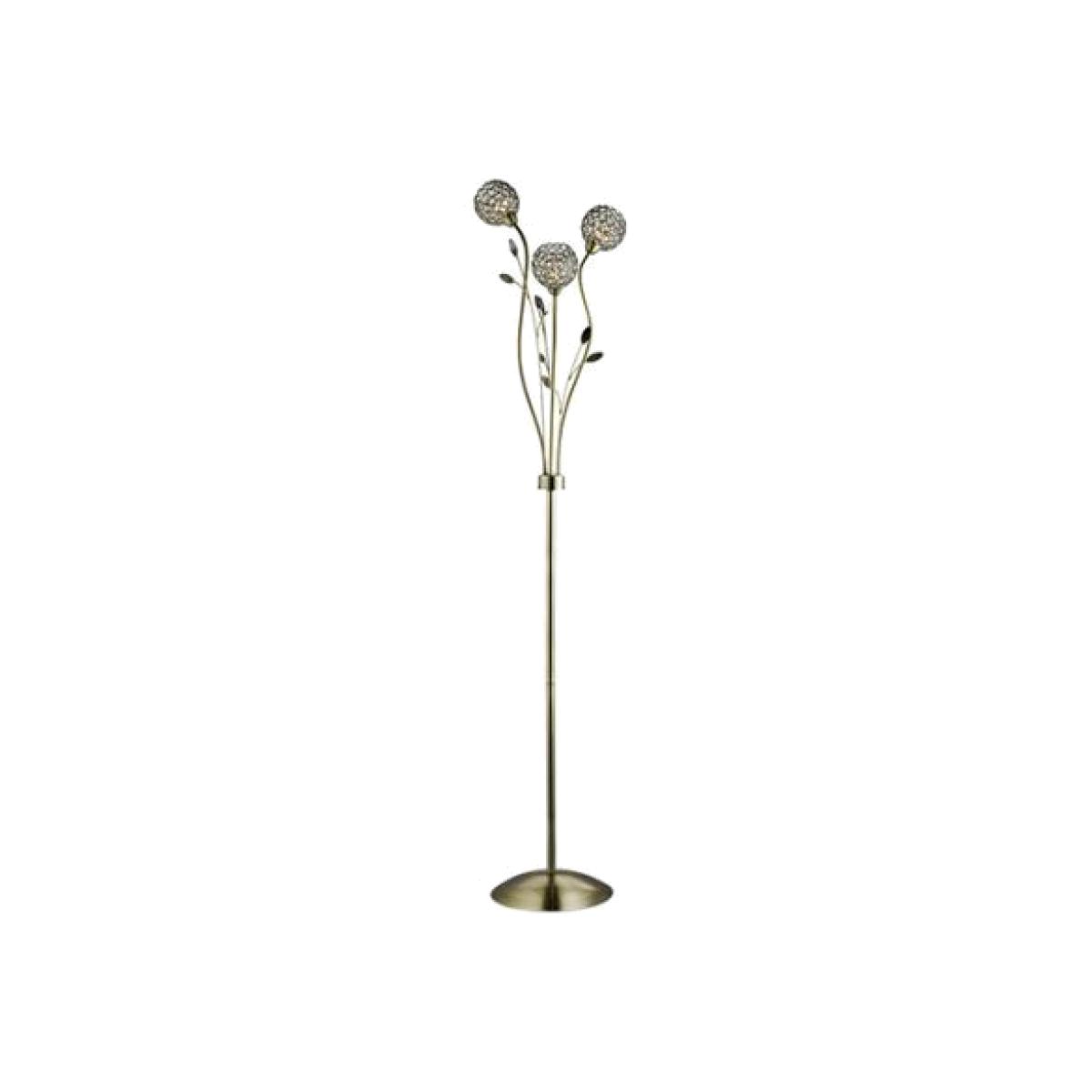This stylish and contemporary floor lamp has 3 beautifully intricate antique brass and glass shades, resting on an antique brass base.  Modern in style but also complementary to traditional settings, this floor light will look great in Living Rooms in the best-dressed home.  Dimensions - 166cm H Requires 3 G9 Halogen Bulbs (not included) Maximum Wattage - 3 x 33w All screens vary in colour reproduction and whilst every effort has been made to display the colour as accurately as possible it is for guidance only.