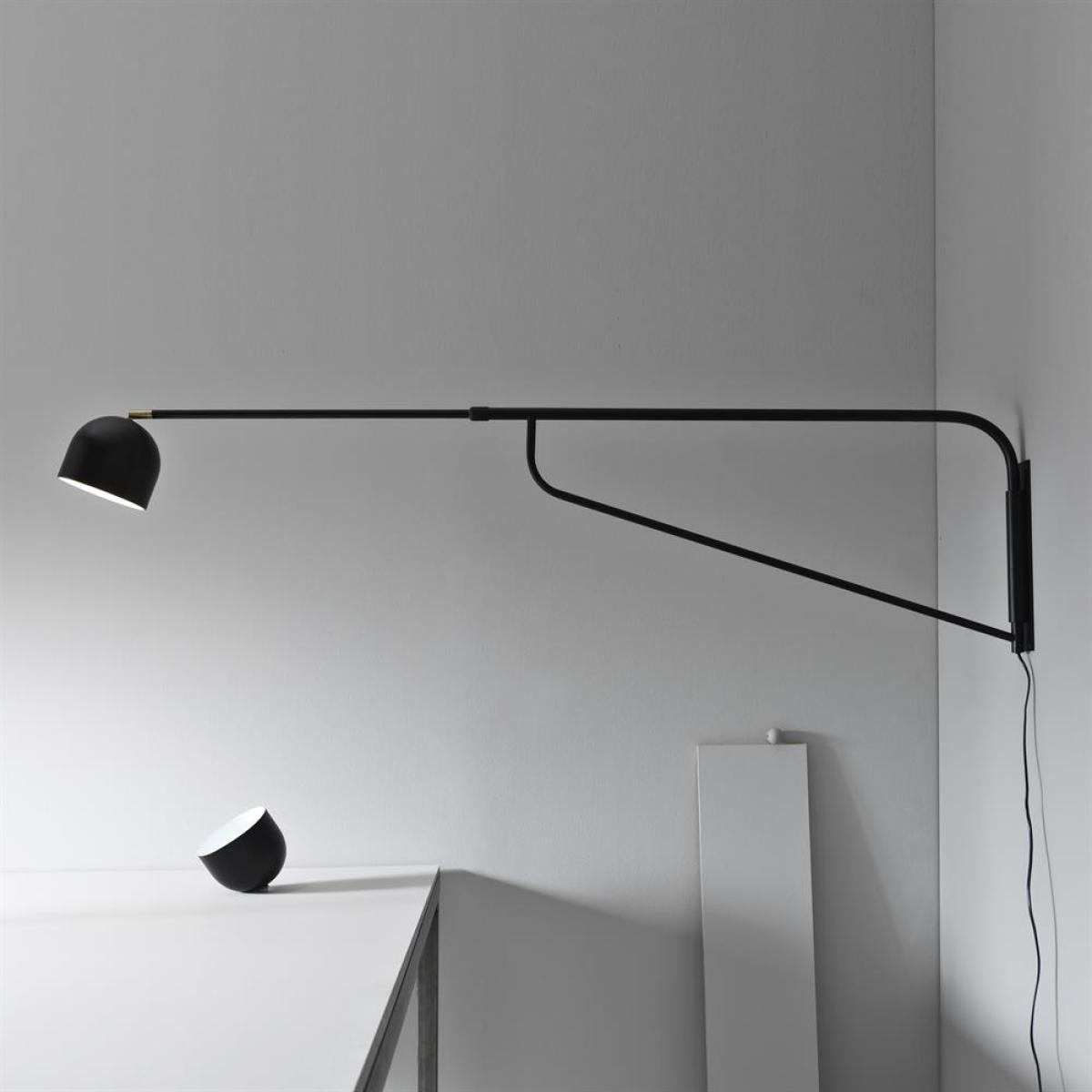 The Bellman wall lamp by Pholc was designed by Sabrina Grubbeson. The simple, clean design has a long arm that reached into the room, making it perfect for an oddly shaped reading nook or above the bed, reaching over the headboard. The lamp is made of powder-coated steel with brass details.