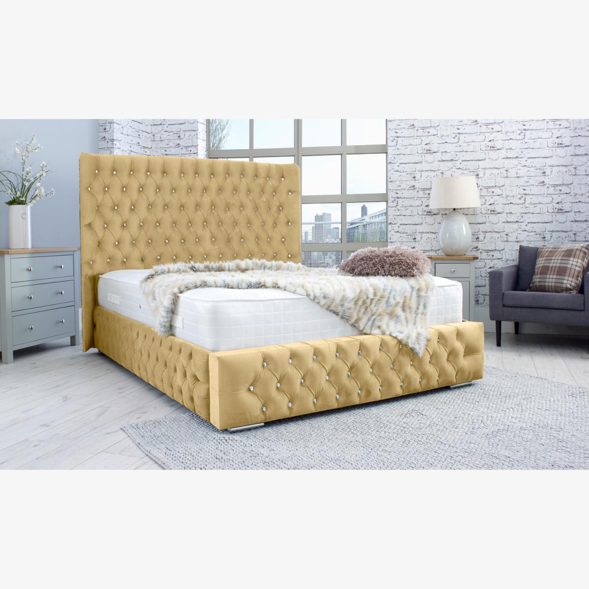 When you need to add a layer of style and elegance to your sleeping area, the Bello bed, with its plush velvet fabric and the highly padded frame, is the top choice for you. Its oversized Bello-styled padded cushion headboard with classic diamante button detailing all adds a touch of sophistication to your bedroom. The Spanish upholstery winged headboard makes for a relaxing spot in the morning or evening. With its plush velvety fabric and comfy padding, you can always look forward to getting to your bedroom every day. The sturdy feel of the Bello bed is supported by a solid board base and chrome feet. You can choose from the different color options. The mattress and accessories are not included in the package.