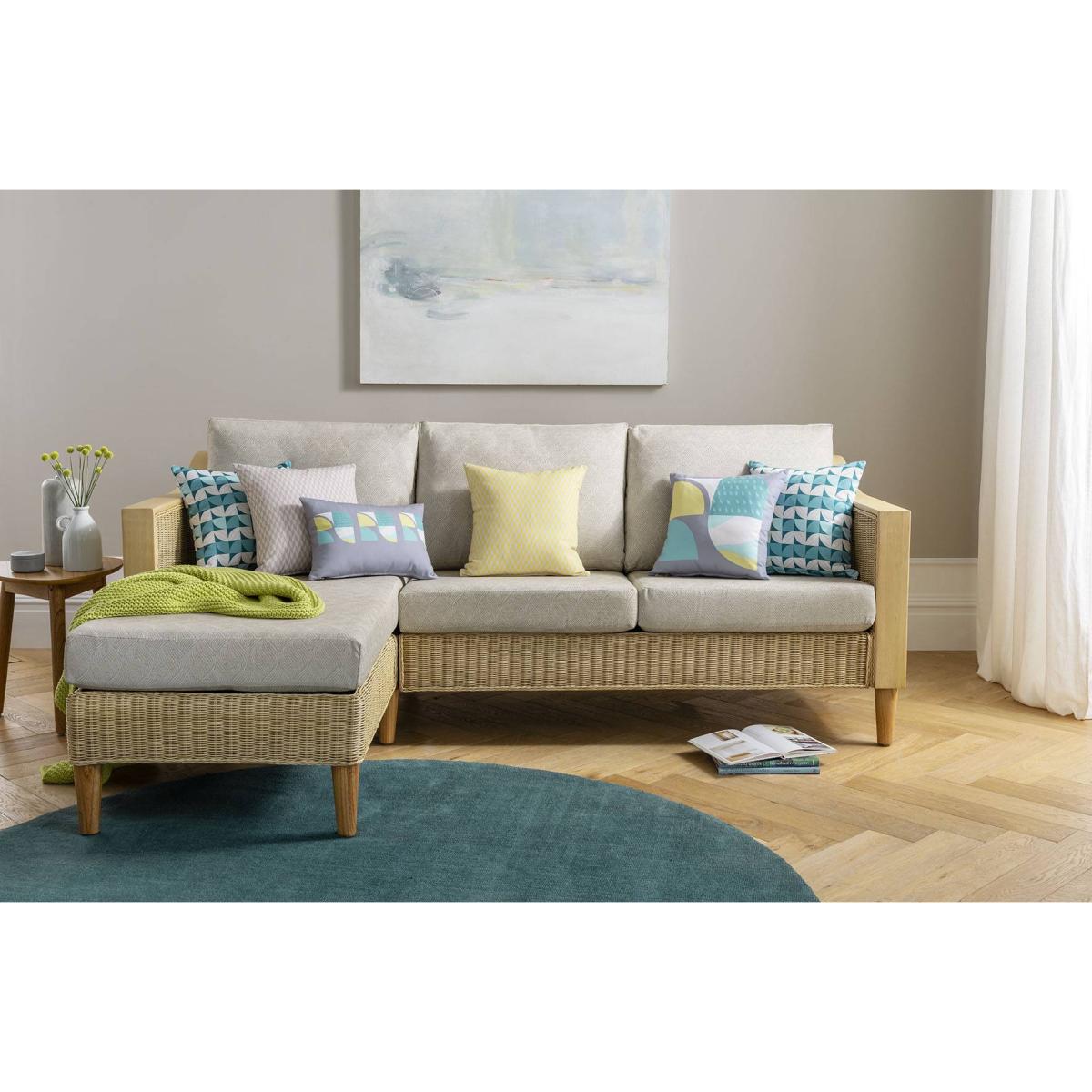 The Bellshill large chaise set is a versatile piece that works beautifully in both contemporary and coastal-inspired interiors. Its light natural wash finish makes it perfect for spaces expecting a relaxed, airy feel, while its generous corner configuration offers excellent lounging space. I love to style this sofa with soft, neutral throws and cushions in textured fabrics to emphasise its cosy appeal. Practical tips include pairing it with light wooden or rattan accents to enhance its natural look, and placing it in a room with ample natural light to highlight its fresh finish. This sofa is ideal for open-plan living areas or conservatories where comfort and style are equally important.