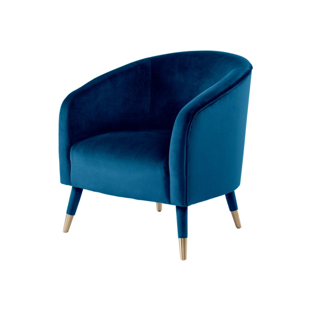 I love this navy armchair for its bold colour and sleek silhouette, making it a versatile statement piece. It works particularly well in contemporary or mid-century inspired interiors, adding a pop of colour without overwhelming the space. Practical styling tips include pairing it with light or neutral tones to allow the navy to stand out or mixing it with patterns and textures for a layered, stylish look. Its brass caps add a touch of elegance, making it suitable for both cosy corners and as a focal point in living or bedroom settings. Keep surrounding accessories minimal for a chic, modern aesthetic, or add plush cushions for extra comfort and personality.