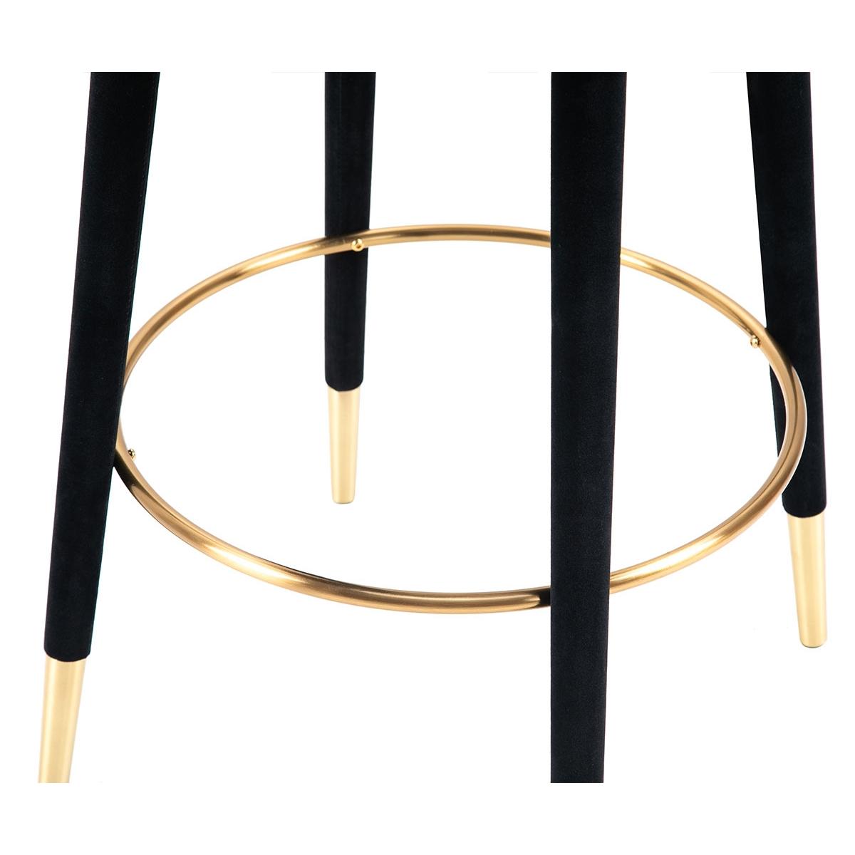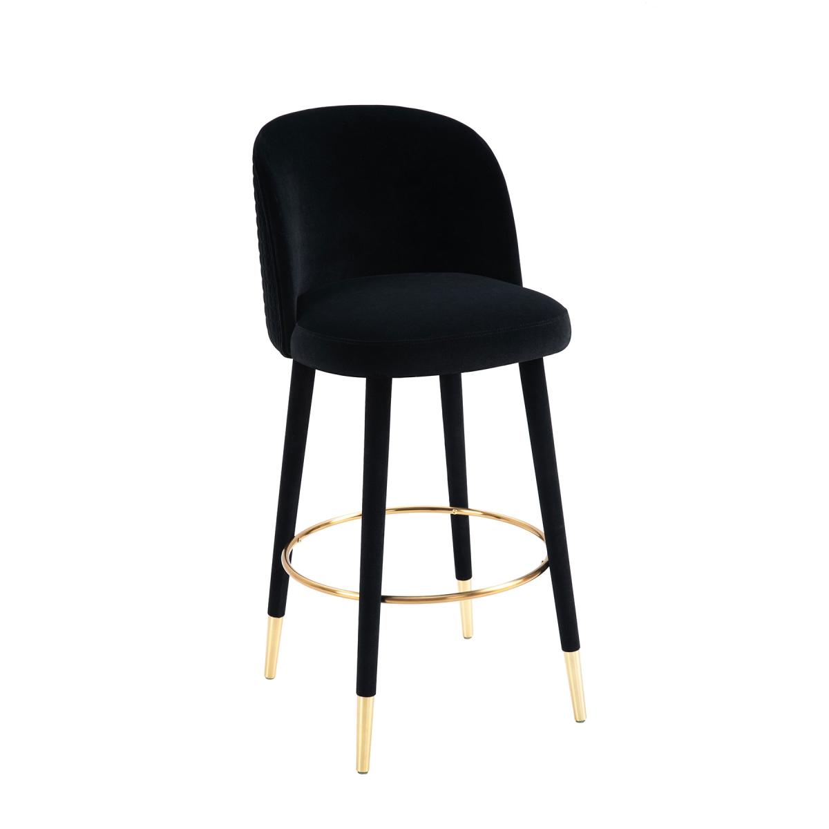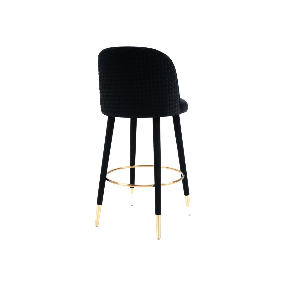 A unique, distinctive and timeless design. Upholstered legs with long brass caps give this bar stool a sleek feminine feel. Wraparound backrest  provides a relaxed and comfortable seating position. Adjustable feet allow for uneven floors. Quilted circle design to back. Velvet fabric. Minimal assembly required, simply attach the legs and footrest.