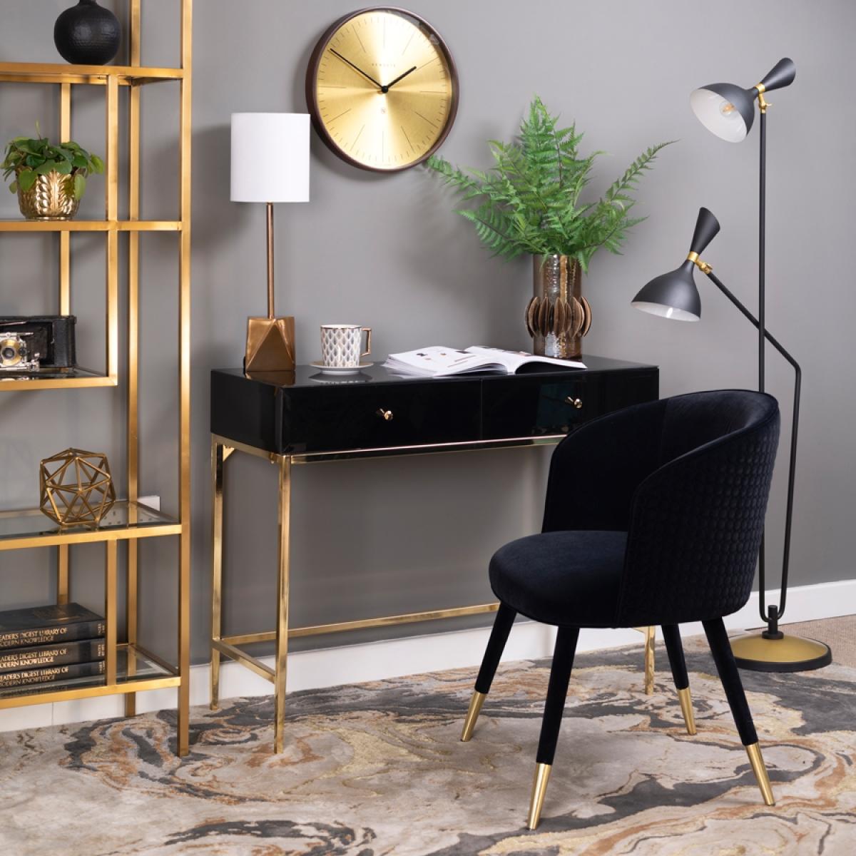 I love this piece for its modern yet sophisticated vibe. The black upholstery combined with brass caps on the legs makes it versatile enough to work across various interiors, from contemporary to classic with a luxe touch. It’s a great choice for dining rooms aiming for a chic, understated look, but can also introduce a stylish, slightly glam element in more eclectic spaces. For styling tips, consider pairing it with a marble or dark wood table to enhance its sleek aesthetic, or soften the look with textured tableware and subtle colour accents like greys or blushes. The brass detailing also means it pairs well with other metallics if you want to layer different finishes, making this a reliable and elegant addition to your dining area.