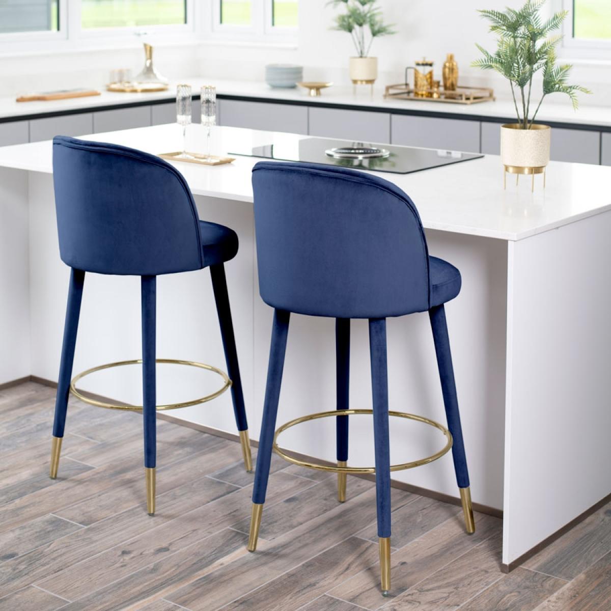 A unique, distinctive and timeless design. Upholstered legs with long brass caps give this bar stool a sleek feminine feel. Wraparound backrest provides a relaxed and comfortable seating position. Adjustable feet allow for uneven floors. Velvet fabric. Minimal assembly required, simply attach the legs and footrest.