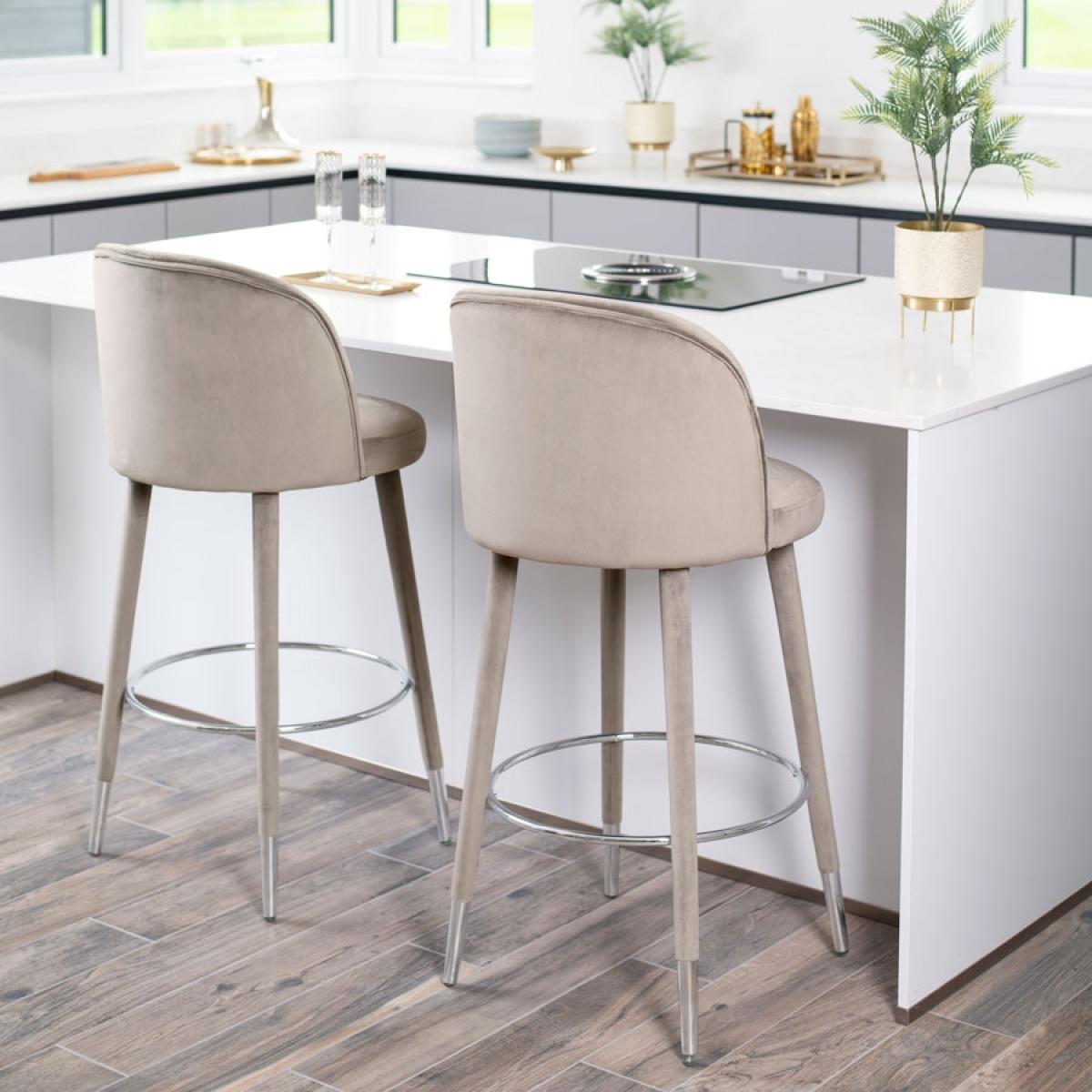 The Bellucci counter stool in taupe with silver caps offers a versatile and contemporary addition to any space. I love its understated elegance and neutral tone, which makes it easy to incorporate into both modern and transitional interiors. It's particularly well-suited for home bars, kitchen islands, or breakfast counters where a sleek, yet comfortable seating option is desired. Practical styling tips include pairing it with textured cushions or throws in contrasting colours for added visual interest, or keeping the surrounding decor minimal to highlight its sophisticated details. Its clean lines and muted palette make it adaptable across various colour schemes and interior styles.