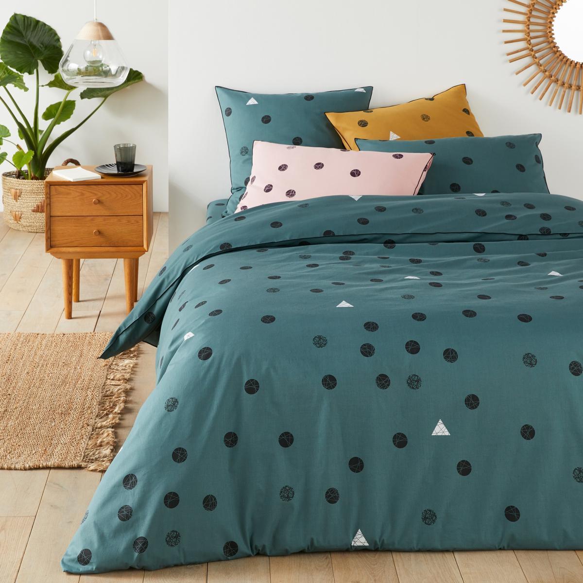 Bellvik Geometric Duvet Cover. Cotton percale : a soft, hard-wearing, high quality fabric, densely woven (70 threads/cm²) made up of combed cotton threads. Printed with polka dots and triangles front and back. Team it up with the rest of the bedding in the range. And mix and match with different colours and designs from our other ranges to add your own unique style to the bedroom