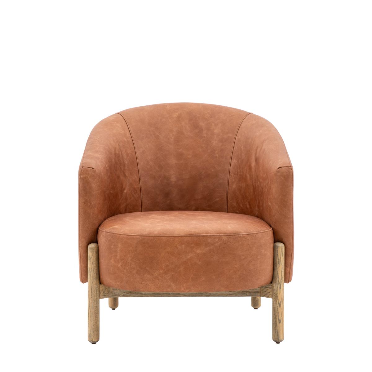 * Curved Back* Deep Seat* Wooden Frame and Legs This armchair features a deep seat and beautifully curved back upholstered in vintage-style brown leather, exuding timeless elegance. The stunning wooden frame and legs add a touch of sophistication, creating a warm and inviting atmosphere.