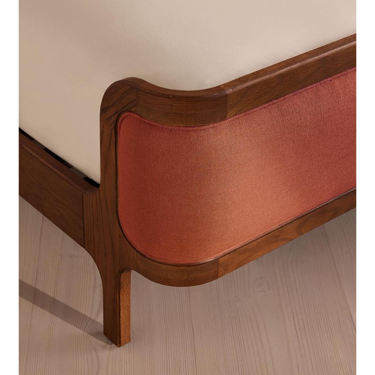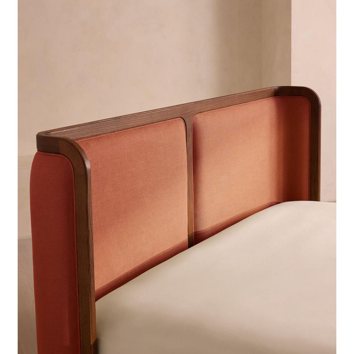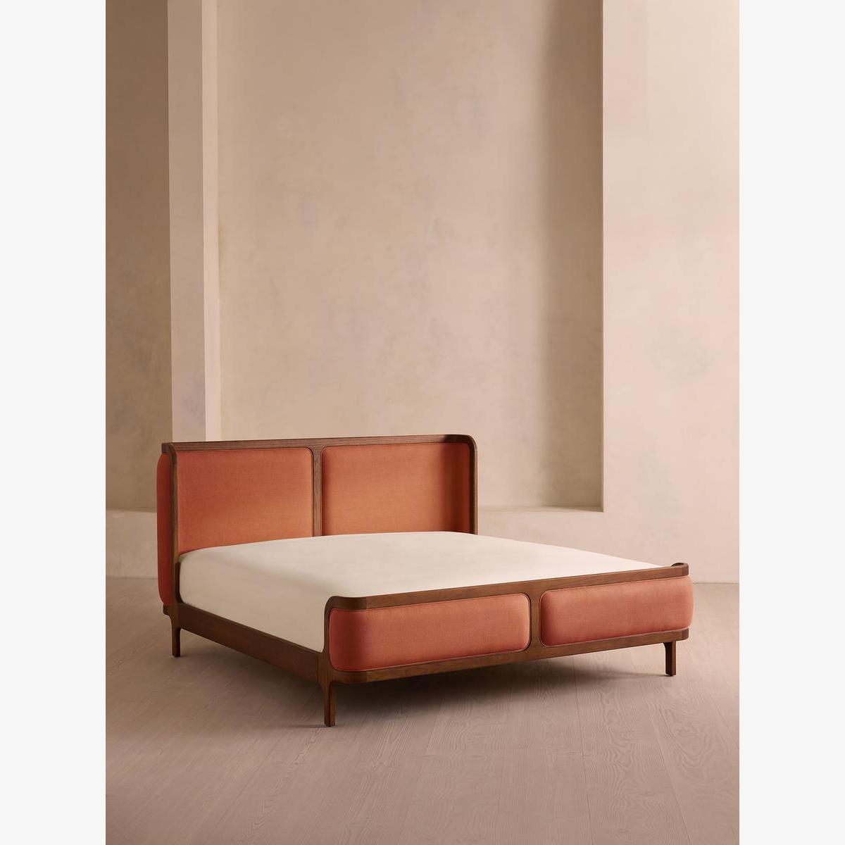 Softened by curved corners, a solid oak frame is upholstered in natural linen. Taking cues from the styles seen throughout the bedrooms of White City House, the Belsa bed has a solid oak frame softened by curved corners that hug the mattress. Its head and footboard are slightly cushioned, and upholstered in natural linen.