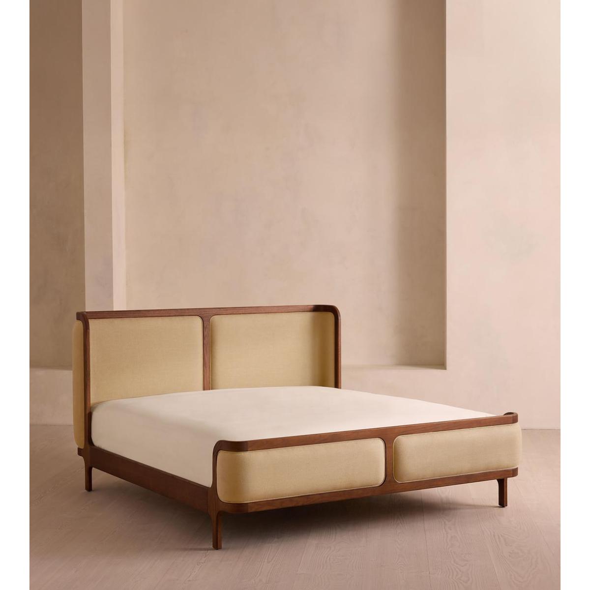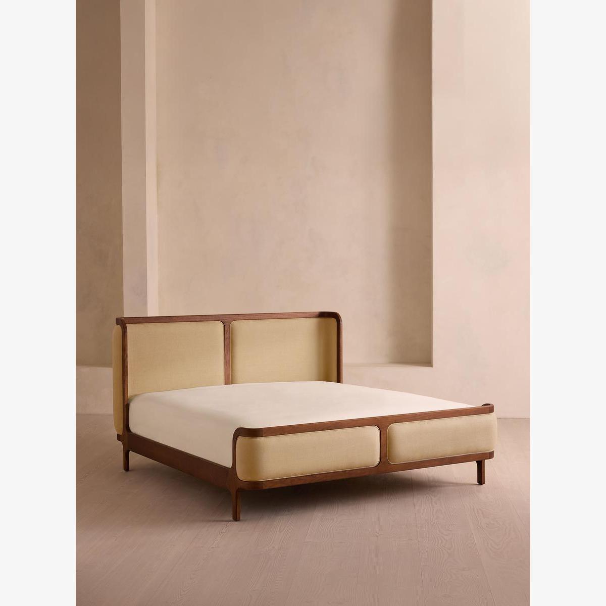 Softened by curved corners, a solid oak frame is upholstered in natural linen. Taking cues from the styles seen throughout the bedrooms of White City House, the Belsa bed has a solid oak frame softened by curved corners that hug the mattress. Its head and footboard are slightly cushioned, and upholstered in natural linen.