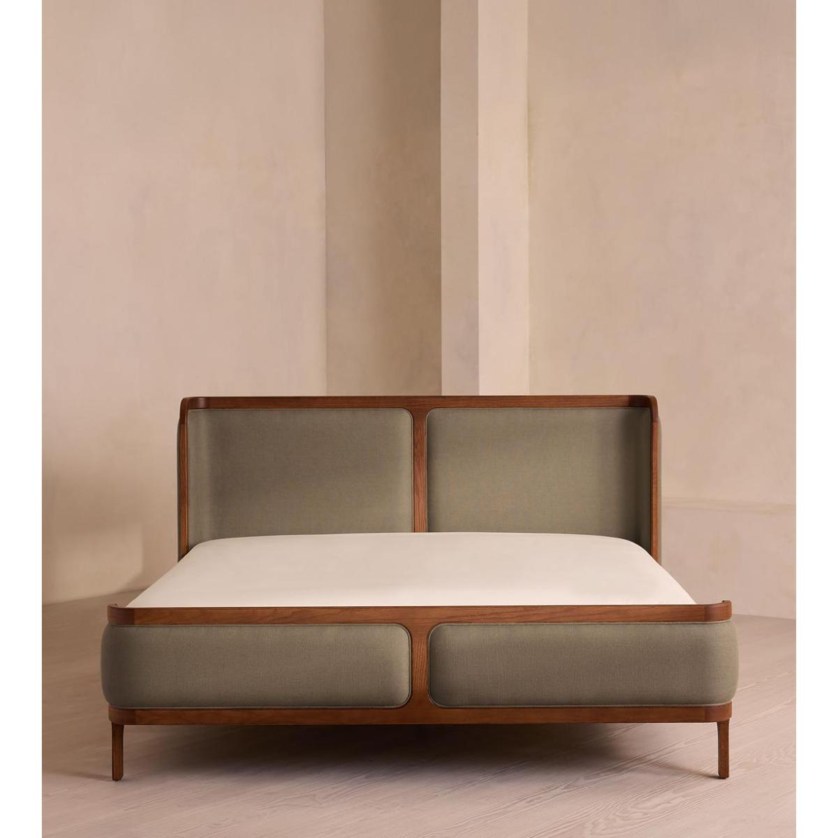 Softened by curved corners, a solid oak frame is upholstered in natural linen. Taking cues from the styles seen throughout the bedrooms of White City House, the Belsa bed has a solid oak frame softened by curved corners that hug the mattress. Its head and footboard are slightly cushioned, and upholstered in natural linen.