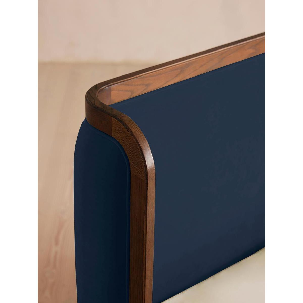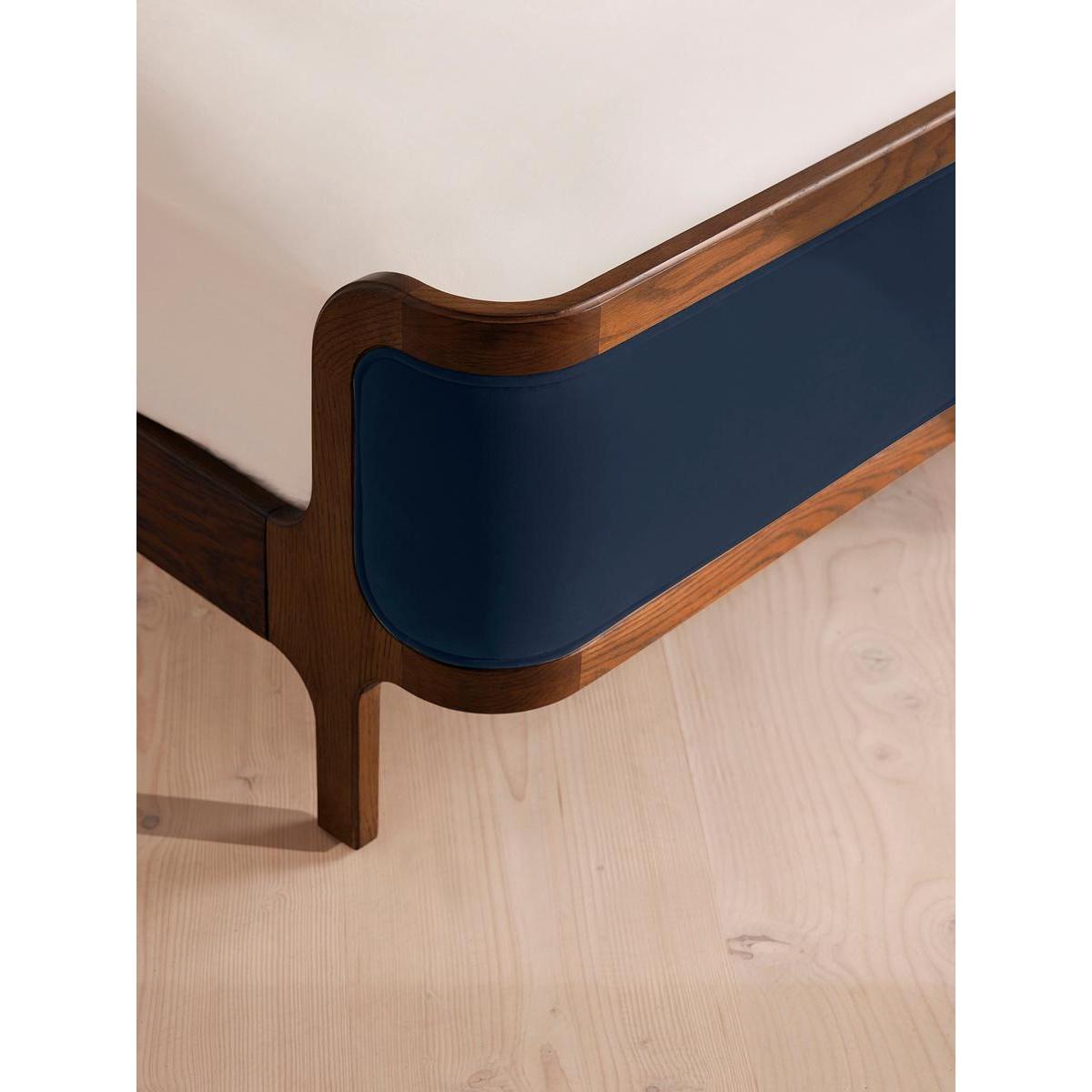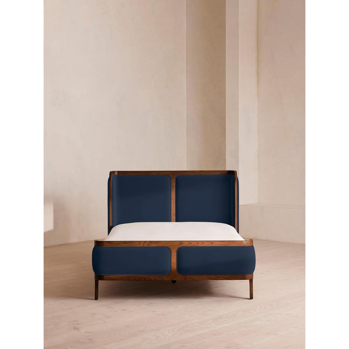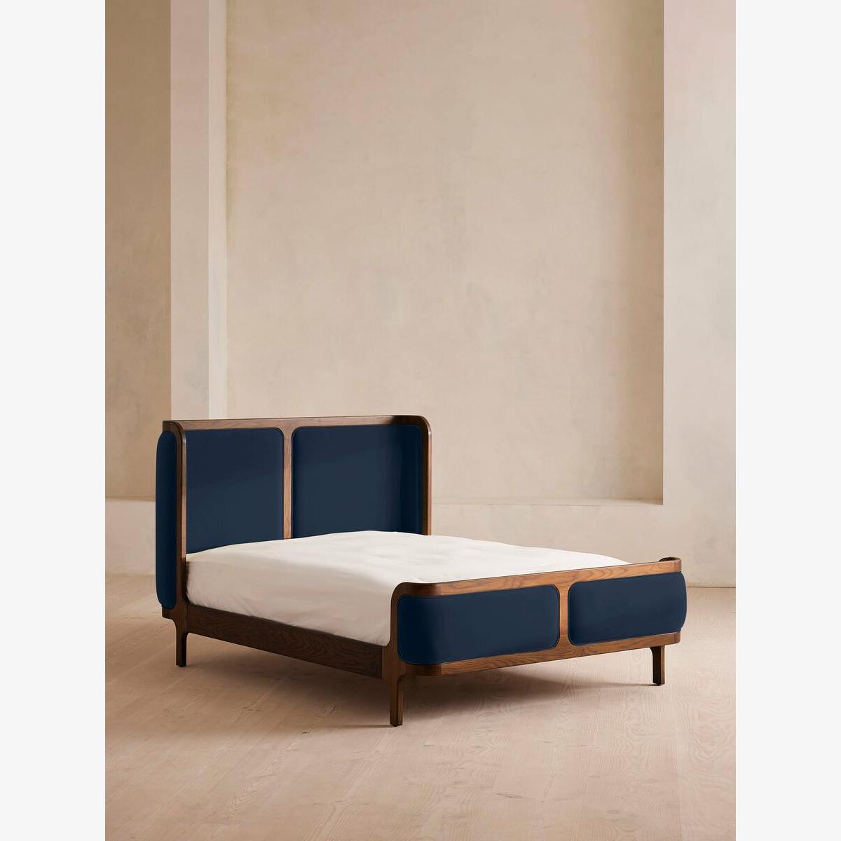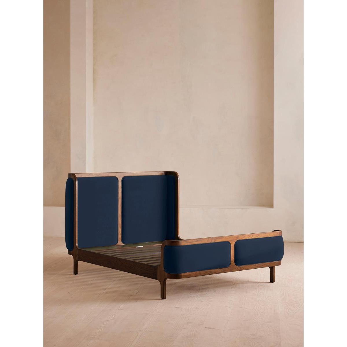 Our Belsa bed creates an enveloping feel with a wraparound headboard and footboard in solid oak and rich velvet upholstery. Taking cues from the mid-century-style beds at White City House, layer with a mix of textiles for a cosy and inviting set-up.