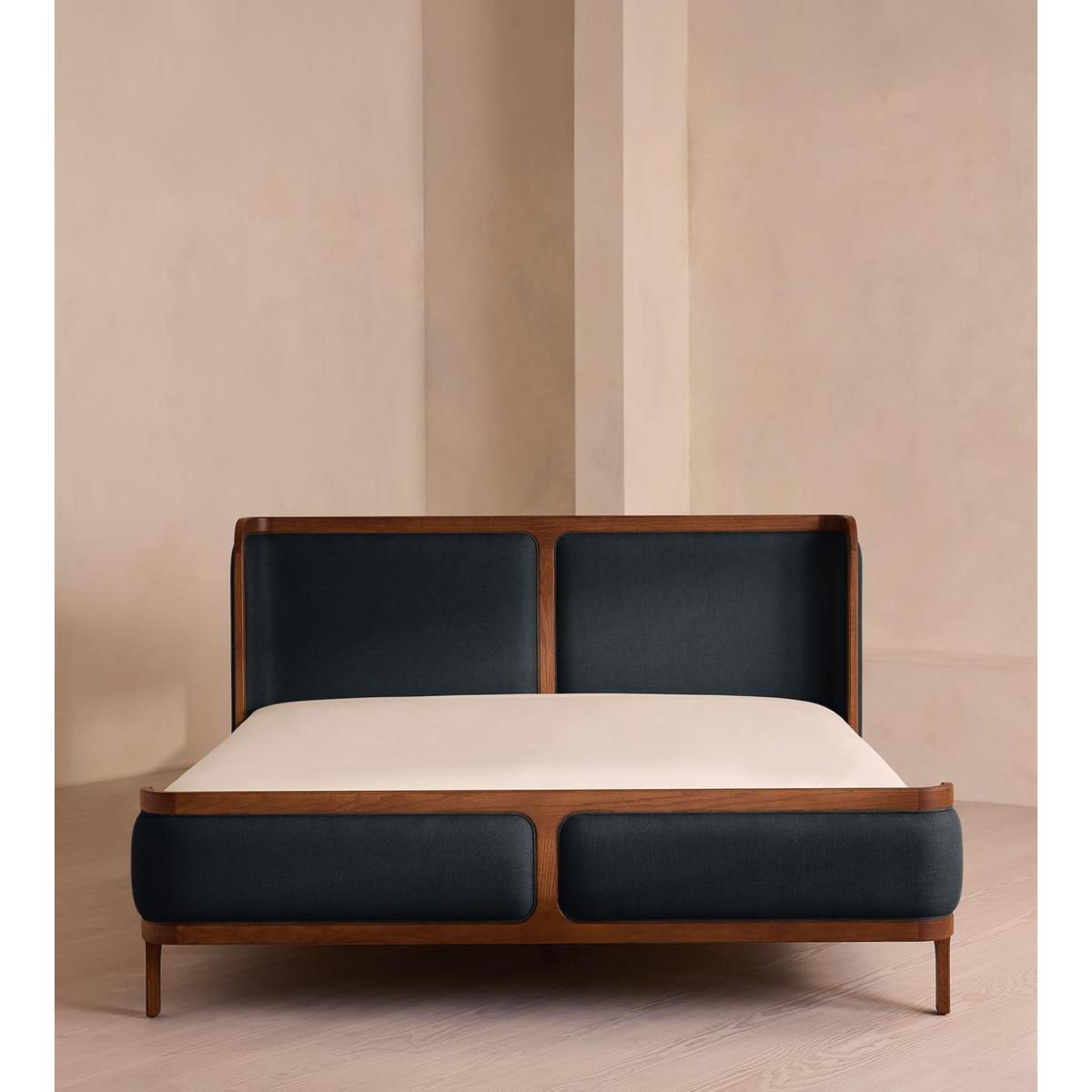 Softened by curved corners, a solid oak frame is upholstered in natural linen. Taking cues from the styles seen throughout the bedrooms of White City House, the Belsa bed has a solid oak frame softened by curved corners that hug the mattress. Its head and footboard are slightly cushioned, and upholstered in natural linen.