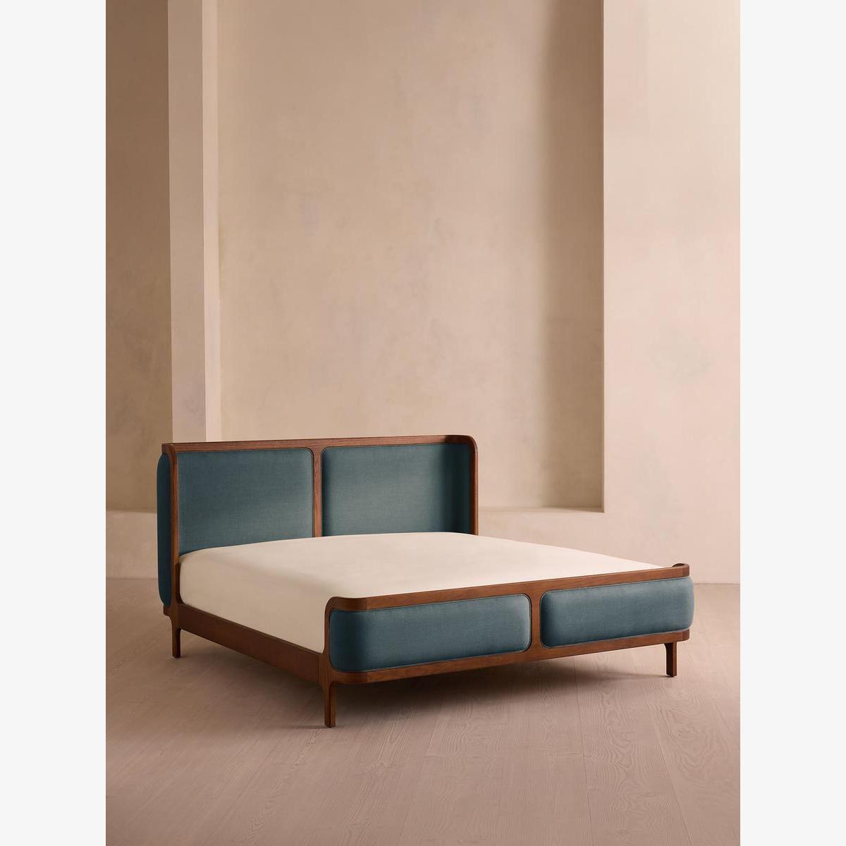 Softened by curved corners, a solid oak frame is upholstered in natural linen. Taking cues from the styles seen throughout the bedrooms of White City House, the Belsa bed has a solid oak frame softened by curved corners that hug the mattress. Its head and footboard are slightly cushioned, and upholstered in natural linen.