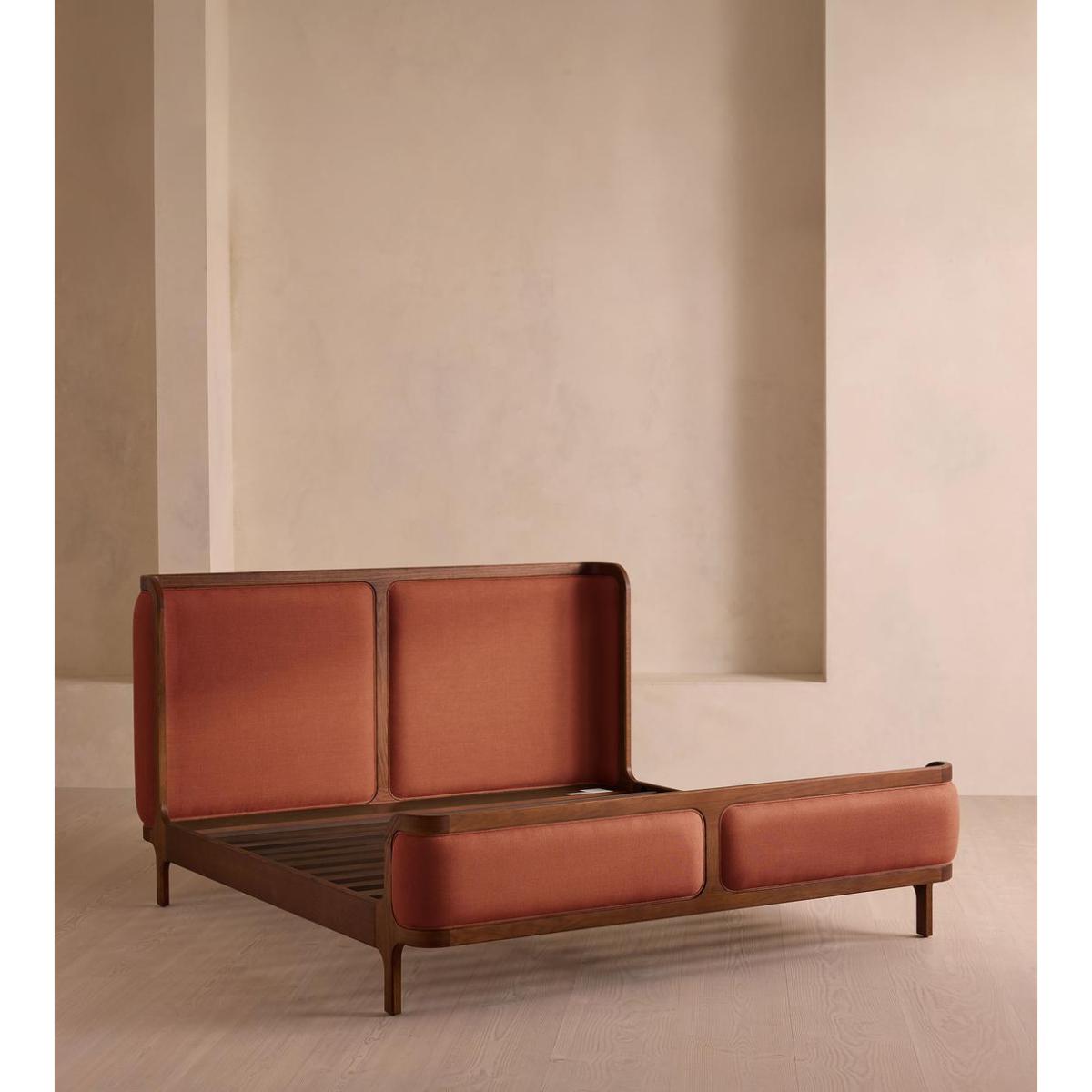 Softened by curved corners, a solid oak frame is upholstered in natural linen. Taking cues from the styles seen throughout the bedrooms of White City House, the Belsa bed has a solid oak frame softened by curved corners that hug the mattress. Its head and footboard are slightly cushioned, and upholstered in natural linen.