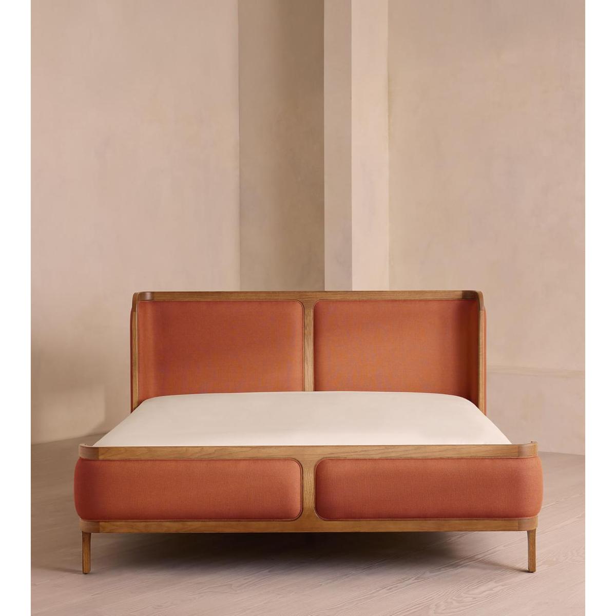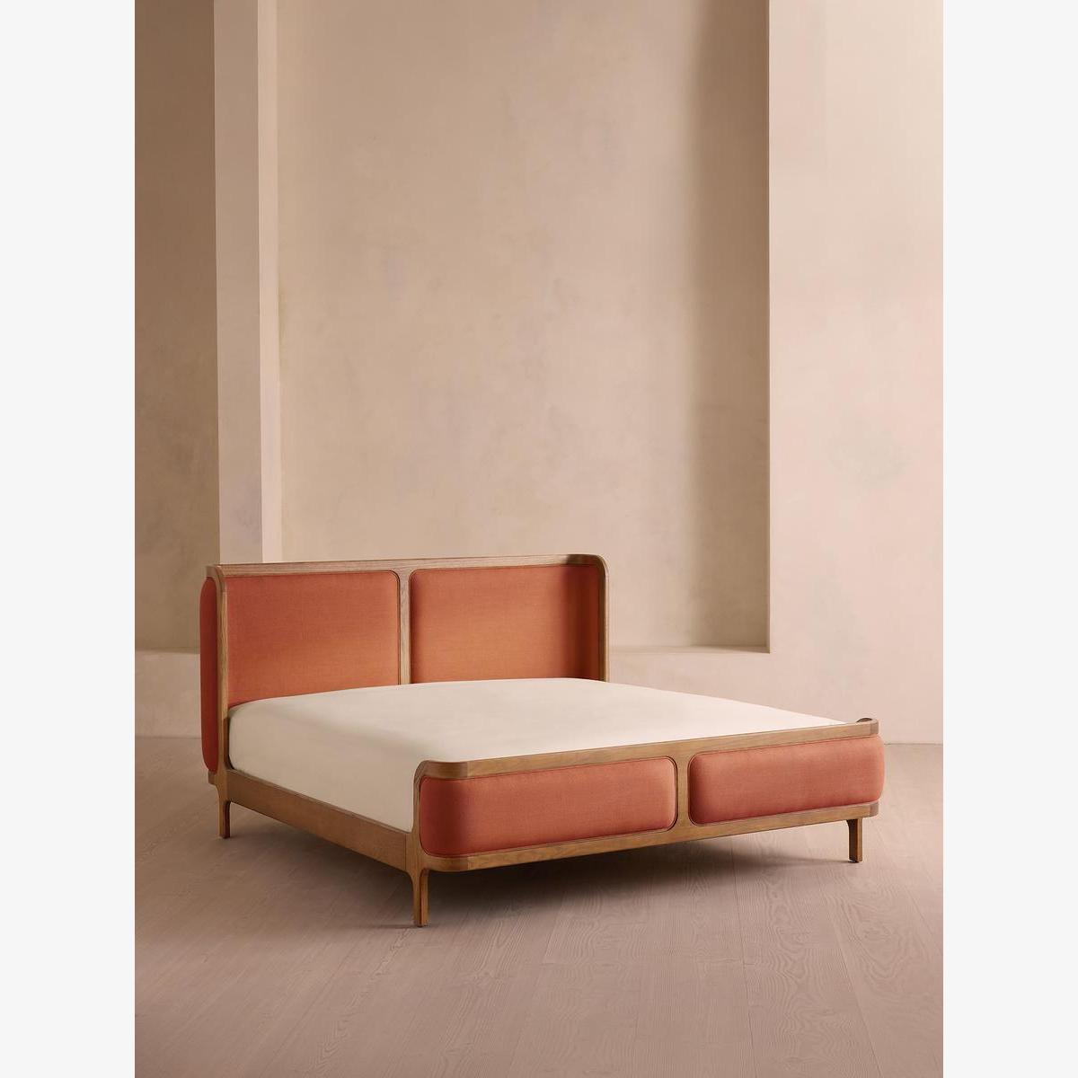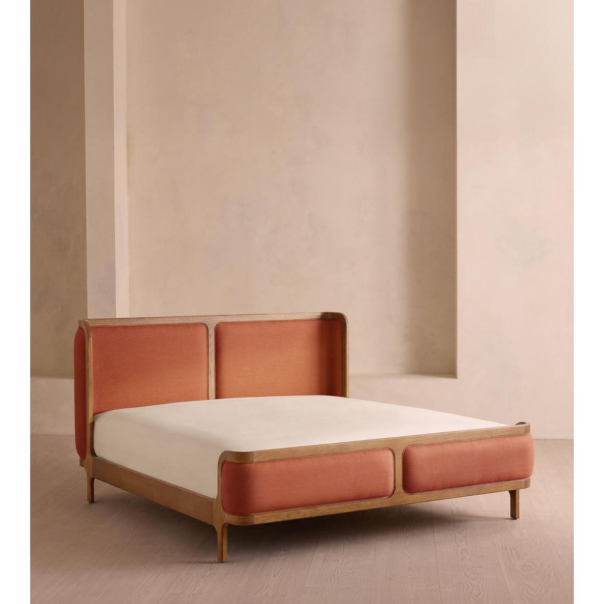 A wraparound headboard and footboard upholstered in linen create an enveloping silhouette. The solid oak frame of our Belsa bed is softened by a curved headboard and footboard, both wrapped in bespoke shades of linen upholstery. Taking cues from the beds at White City House, it creates a cosy, inviting set-up with a mix of textiles, like cushions and blankets from the collection.
