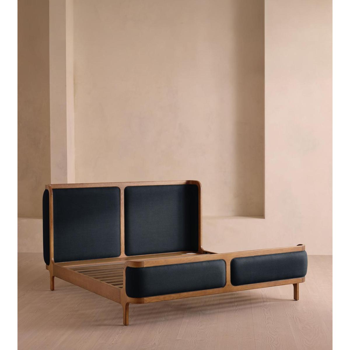 A wraparound headboard and footboard upholstered in linen create an enveloping silhouette. The solid oak frame of our Belsa bed is softened by a curved headboard and footboard, both wrapped in bespoke shades of linen upholstery. Taking cues from the beds at White City House, it creates a cosy, inviting set-up with a mix of textiles, like cushions and blankets from the collection.