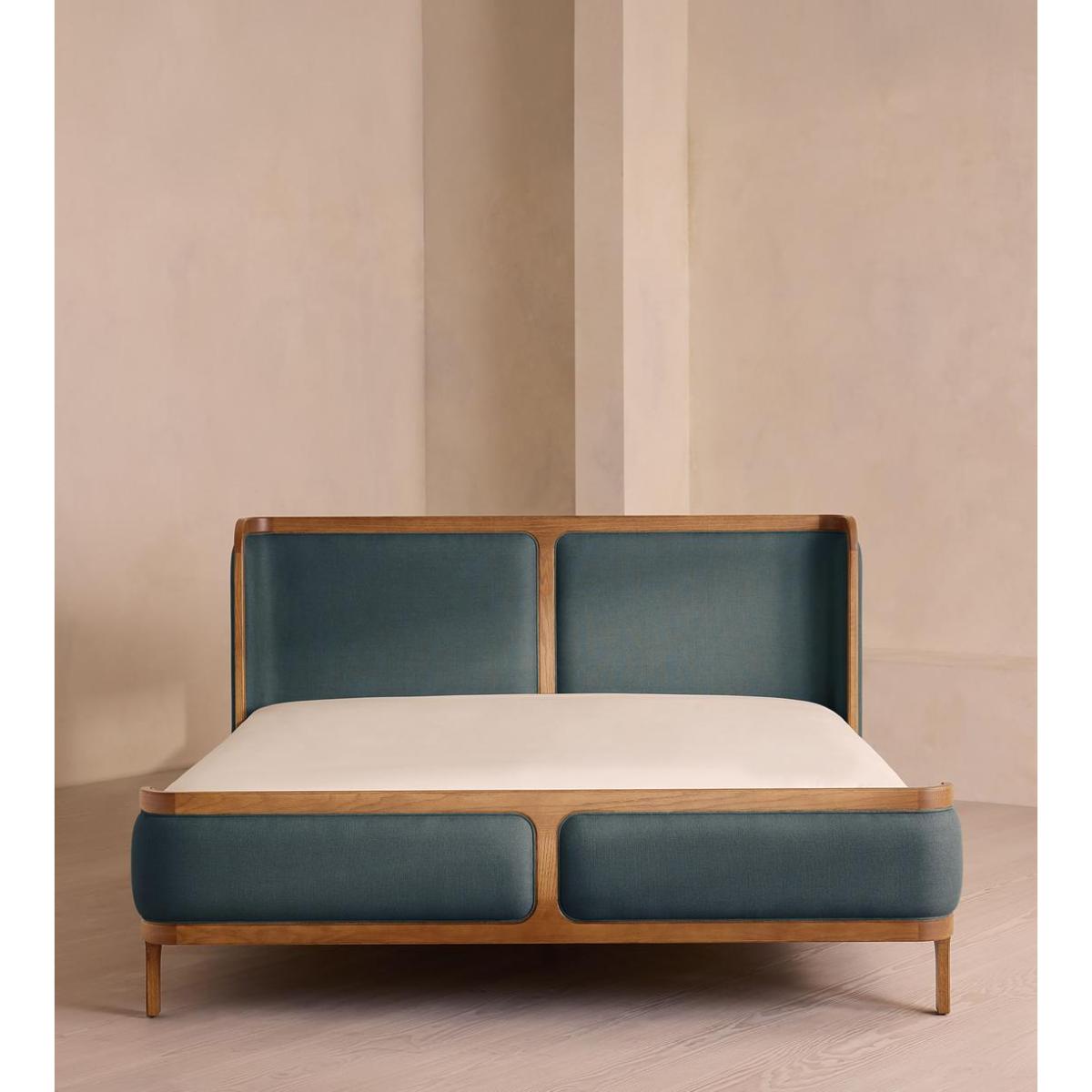 A wraparound headboard and footboard upholstered in linen create an enveloping silhouette. The solid oak frame of our Belsa bed is softened by a curved headboard and footboard, both wrapped in bespoke shades of linen upholstery. Taking cues from the beds at White City House, it creates a cosy, inviting set-up with a mix of textiles, like cushions and blankets from the collection.