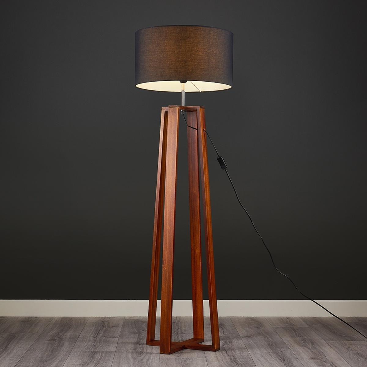 Modern four legged cross design floor lamp in a dark wood finish, complete with a black fabric drum lamp shade and features an in-line onoff switch for easy use. This contemporary floor lamp is a great way to brighten up any room in your home. Its simply yet stylish design will add a minimalist touch to your living space. Ideal for use in lounges, hallways, bedrooms and other living areas.