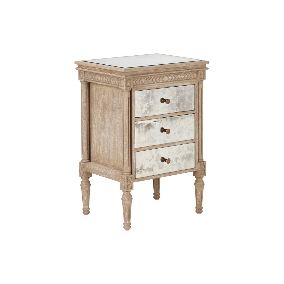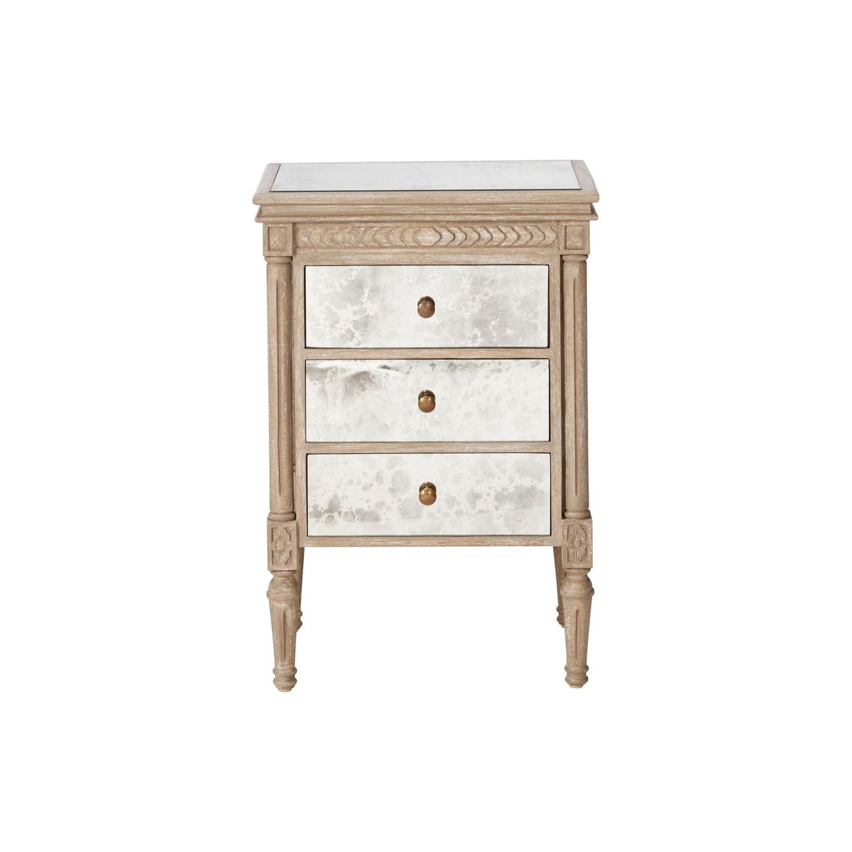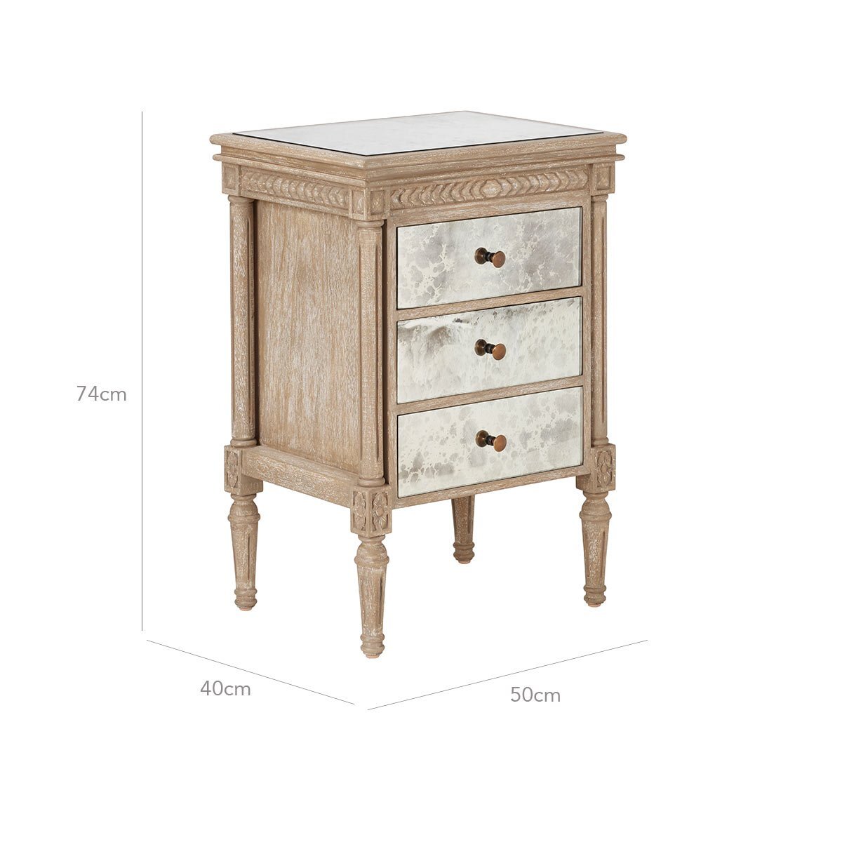 The natural-coloured Benais Chest of Drawers is reminiscent of classic French style. Drawing inspiration from its namesake, a typical rural French town in the Loire Valley, the antiqued mirror-panelled drawers and top bring a glamorous touch to a practical piece. Complete with a carved frieze and legs, this chest of drawers makes a big style statement despite its petite nature. Details: Crafted from mango wood and modern materials, round brass knob handles.