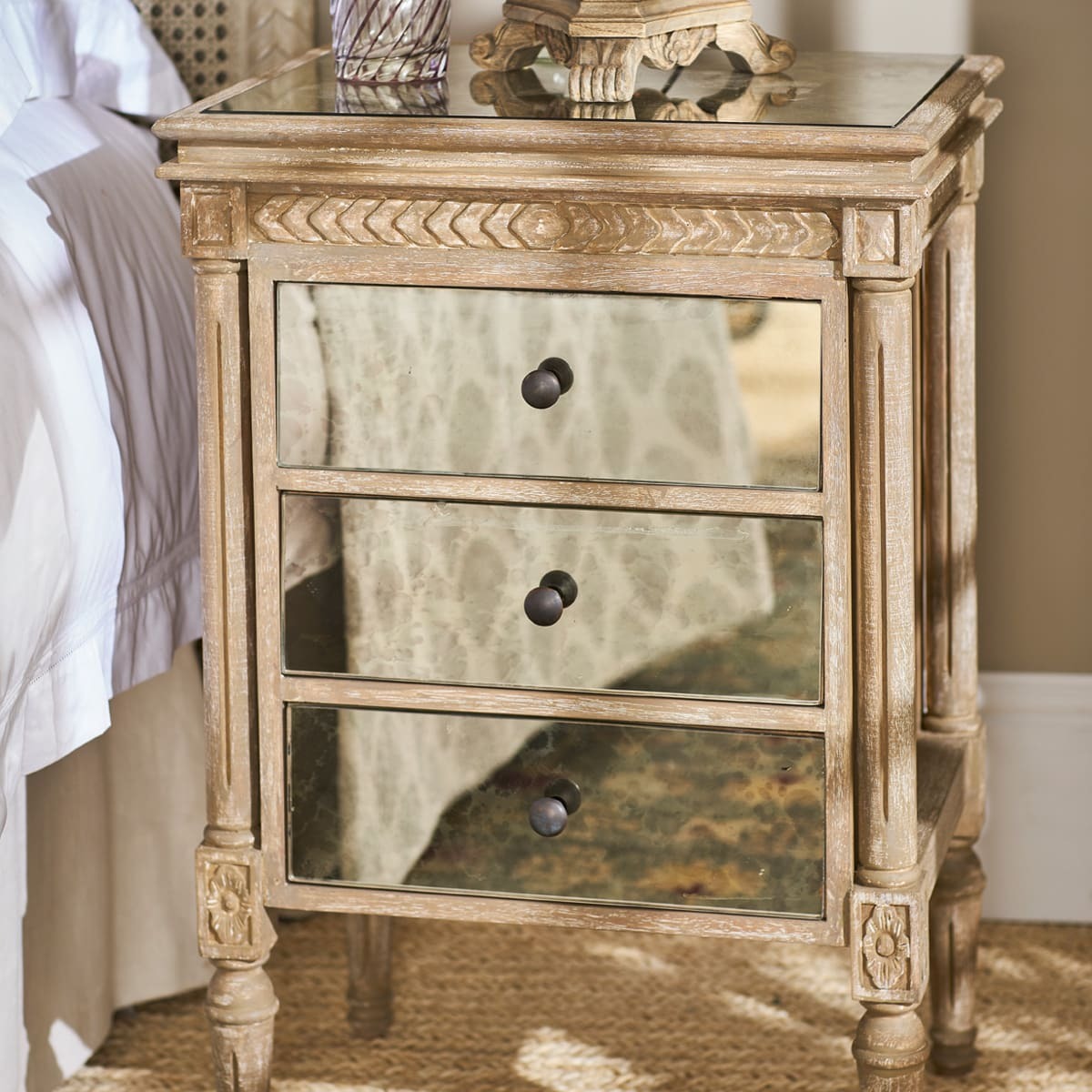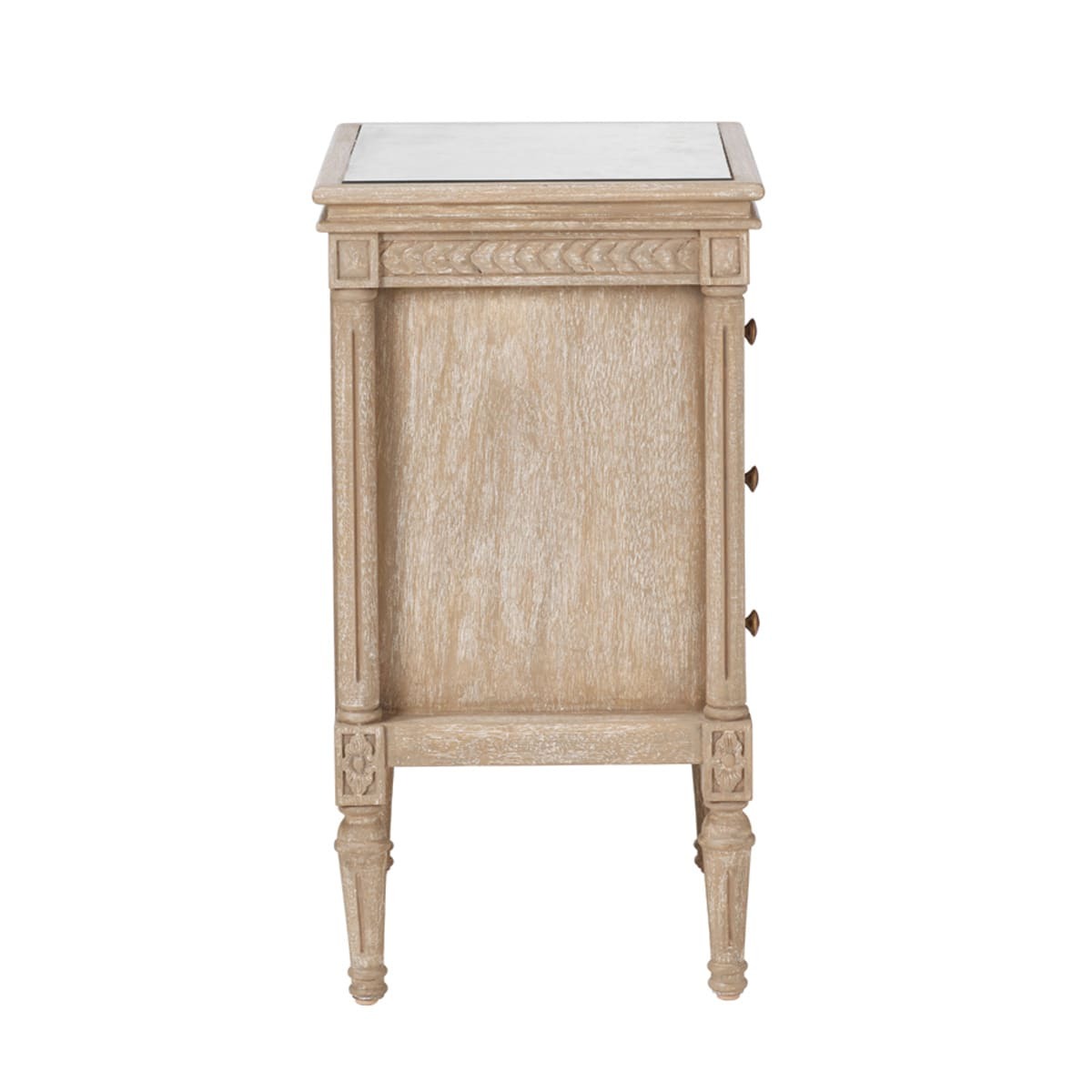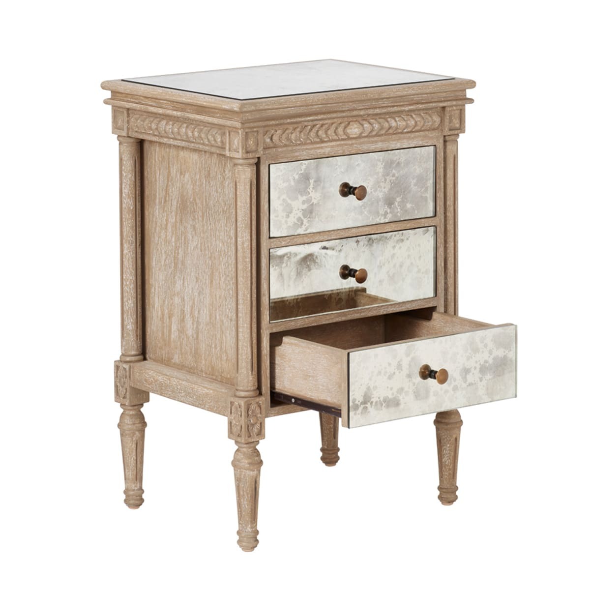 The natural-coloured Benais Chest of Drawers is reminiscent of classic French style. Drawing inspiration from its namesake, a typical rural French town in the Loire Valley, the antiqued mirror-panelled drawers and top bring a glamorous touch to a practical piece. Complete with a carved frieze and legs, this chest of drawers makes a big style statement despite its petite nature. Details: Crafted from mango wood and modern materials, round brass knob handles.