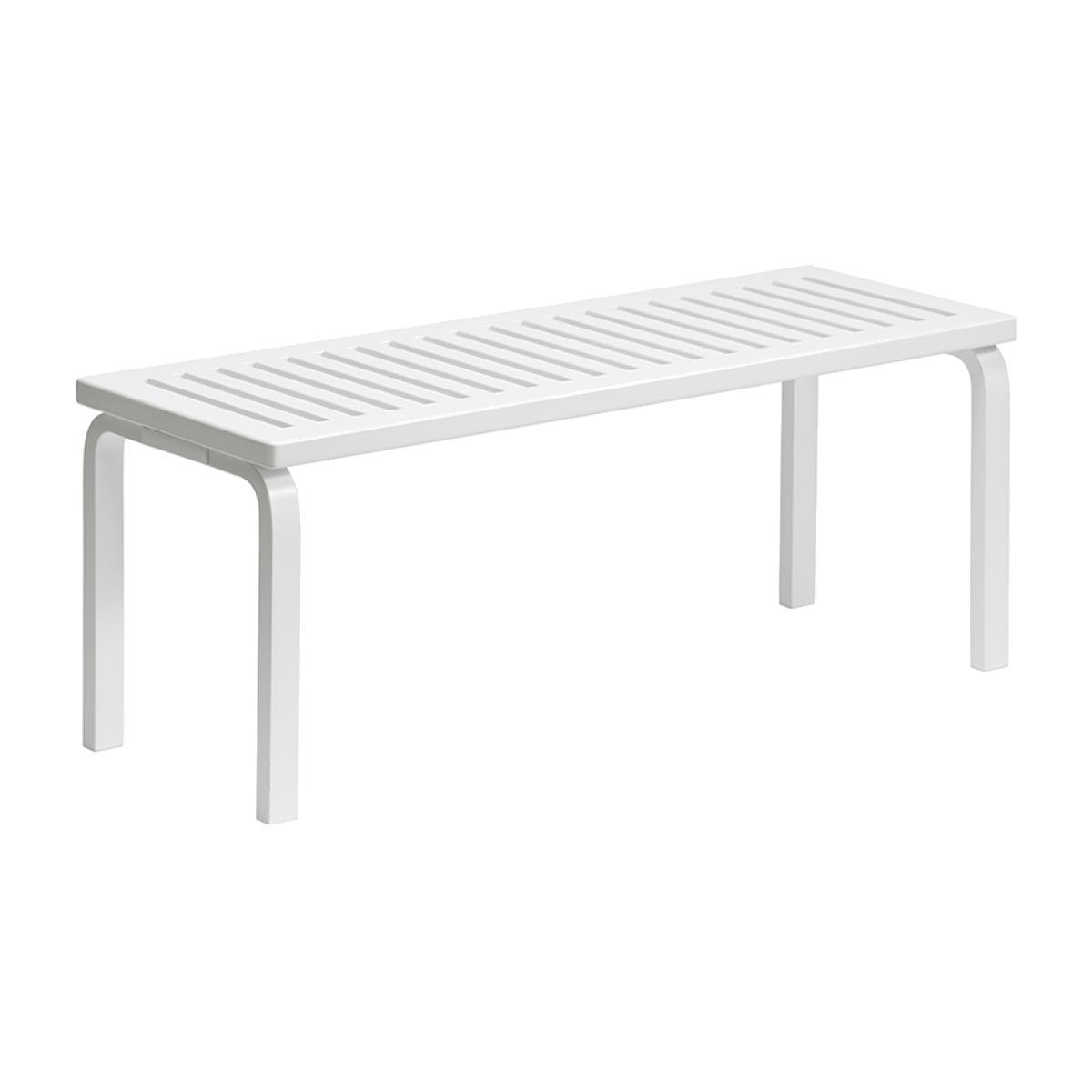 Designed by legendary Finnish designer Alvar Aalto for Artek in 1945, Bench 153. A represents the pinnacle of functionalist furniture design, characterised by its revolutionary curved L-leg. Available in natural, black lacquered and white lacquered birch, this versatile bench can be used for a multitude of purposes, including as a seat, shelving display or for storage. Crafted in Finland from solid Finnish birch wood, the airy seat rests on Aalto's signature L-legs. Created by bending a piece of birch to a curved 90° angle, the L-leg can be fastened directly to the seat, eliminating the need for complicated framework or support and creating Aalto's signature streamlined and simple aesthetic. Alvar Aalto was one of the founding members of Finnish manufacturer, Artek, and embraced strong individuality with focus on designing predominantly for humanity, creating functional and dynamic pieces for public and personal spaces alike. Instantly recognisable as a classic Alvar Aalto design, this bench would make a stylish addition to any hallway, bedroom or dressing room.