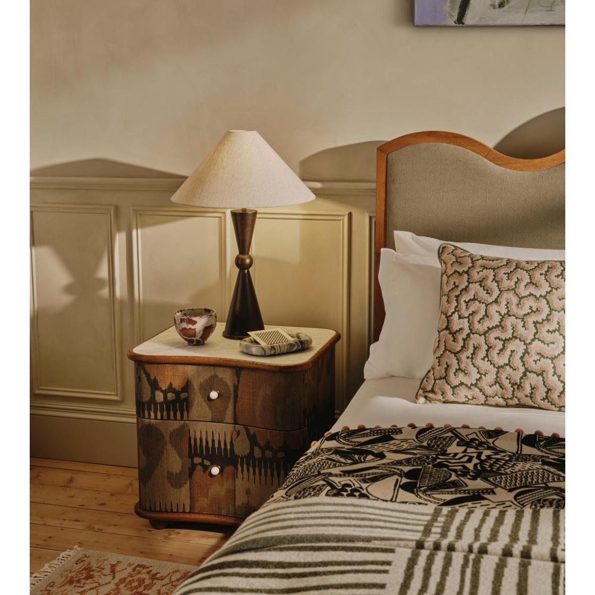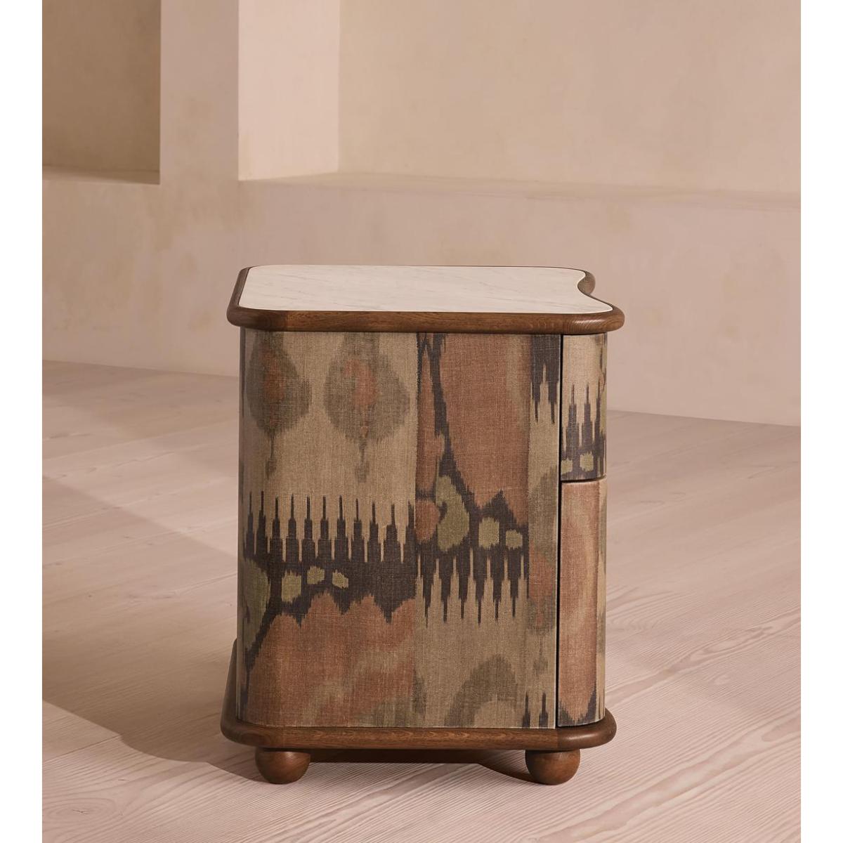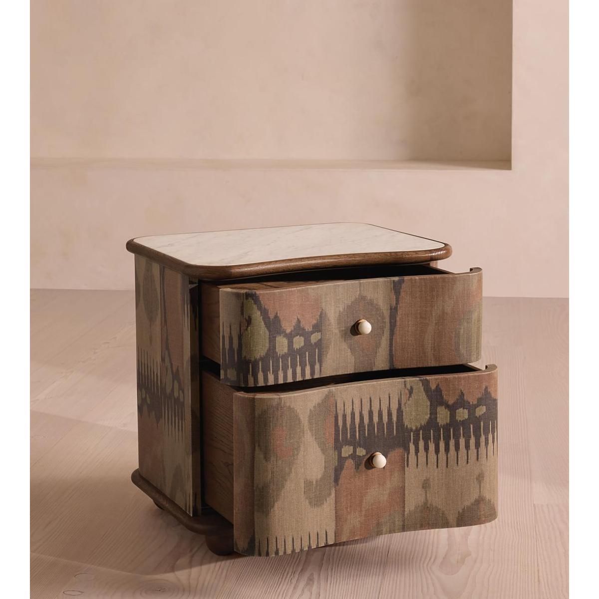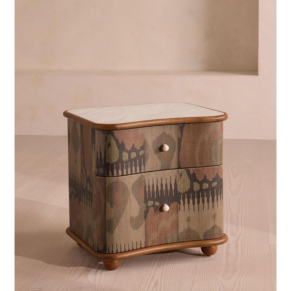 A unique concave silhouette is upholstered in floral ikat and finished with an Italian-sourced marble top. Characterised by its concave front, the Benedetta bedside table is wrapped in our floral ikat-patterned fabric. An Italian-sourced Carrara marble inlay forms the tabletop, surrounded by dark-stained oak lipping to match the base, handles and bun feet.