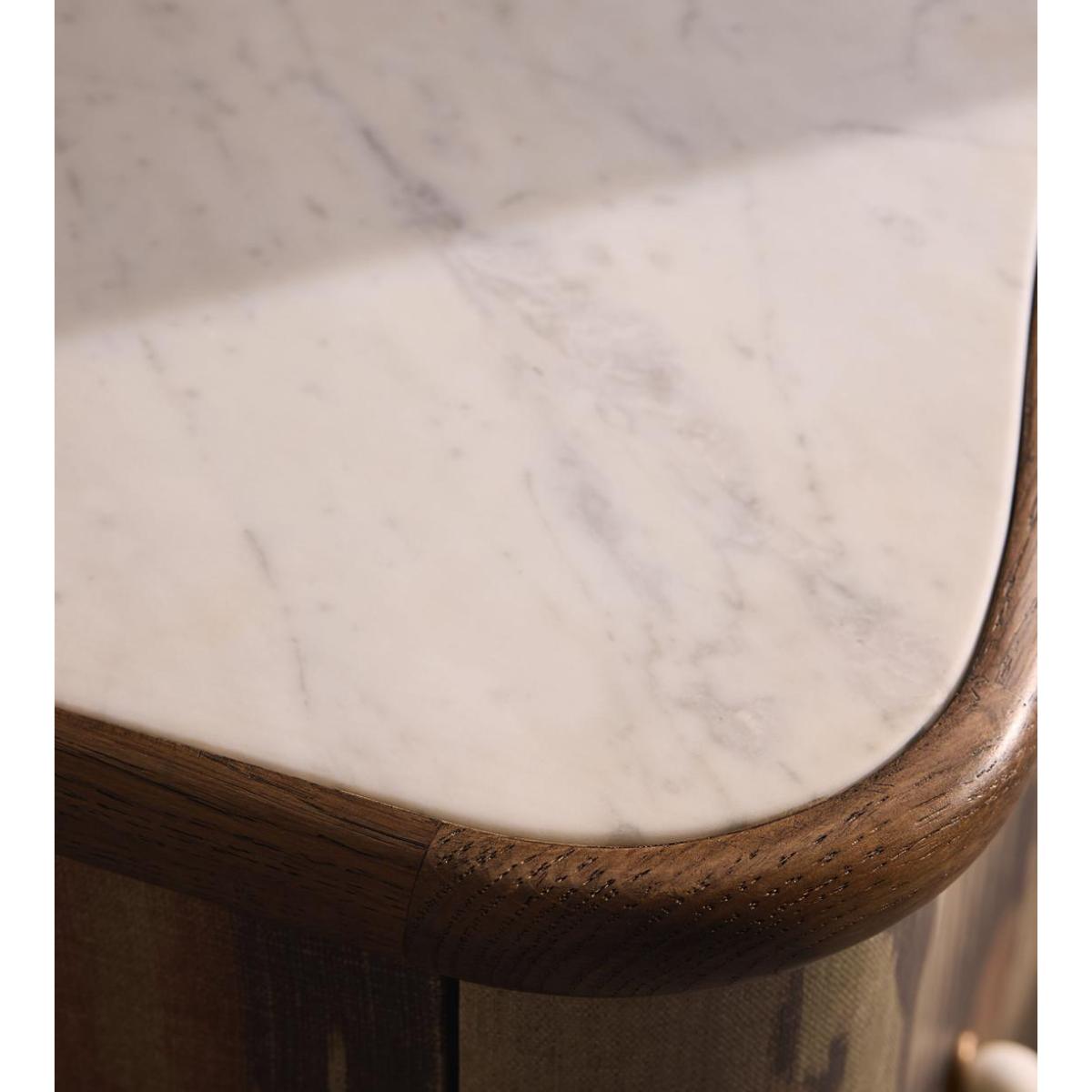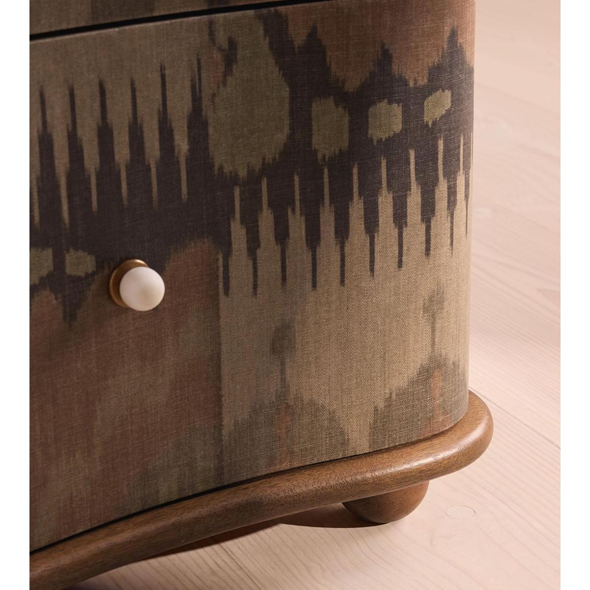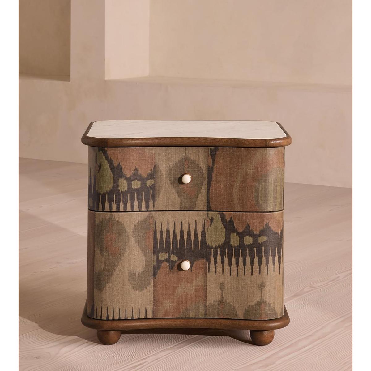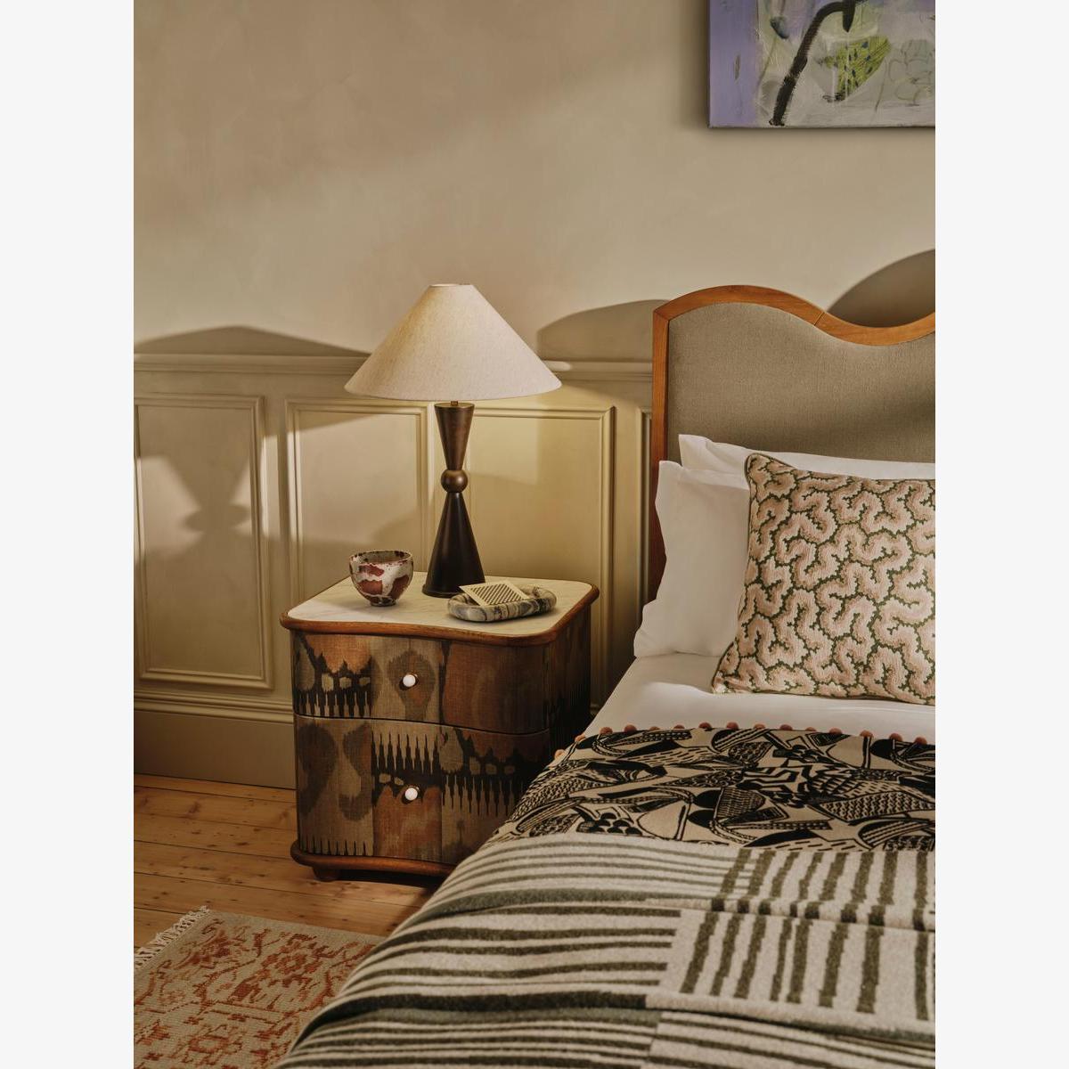 A unique concave silhouette is upholstered in floral ikat and finished with an Italian-sourced marble top. Characterised by its concave front, the Benedetta bedside table is wrapped in our floral ikat-patterned fabric. An Italian-sourced Carrara marble inlay forms the tabletop, surrounded by dark-stained oak lipping to match the base, handles and bun feet.