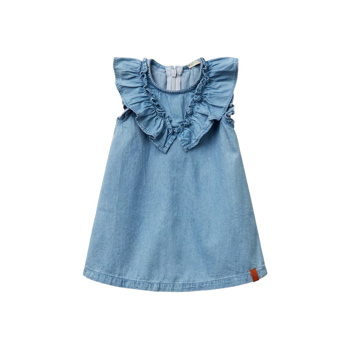 A cute sleeveless dress from Benetton in pure cotton chambray. Designed with a flared cut, crew neck, ruched armholes and ruffle details on the front and back. Finished with a practical zip opening on the back.