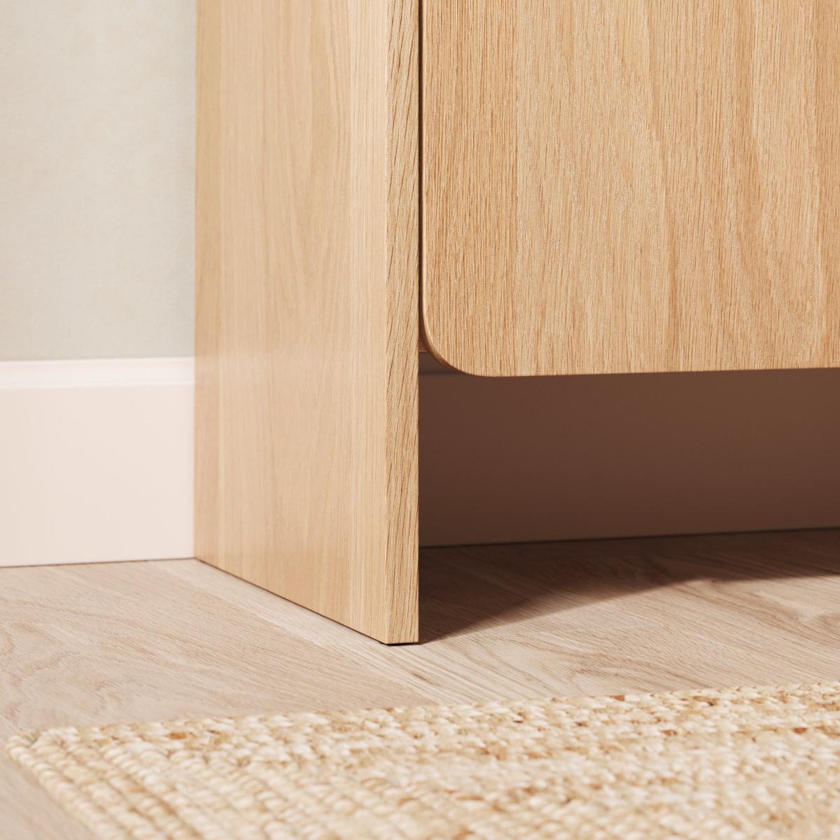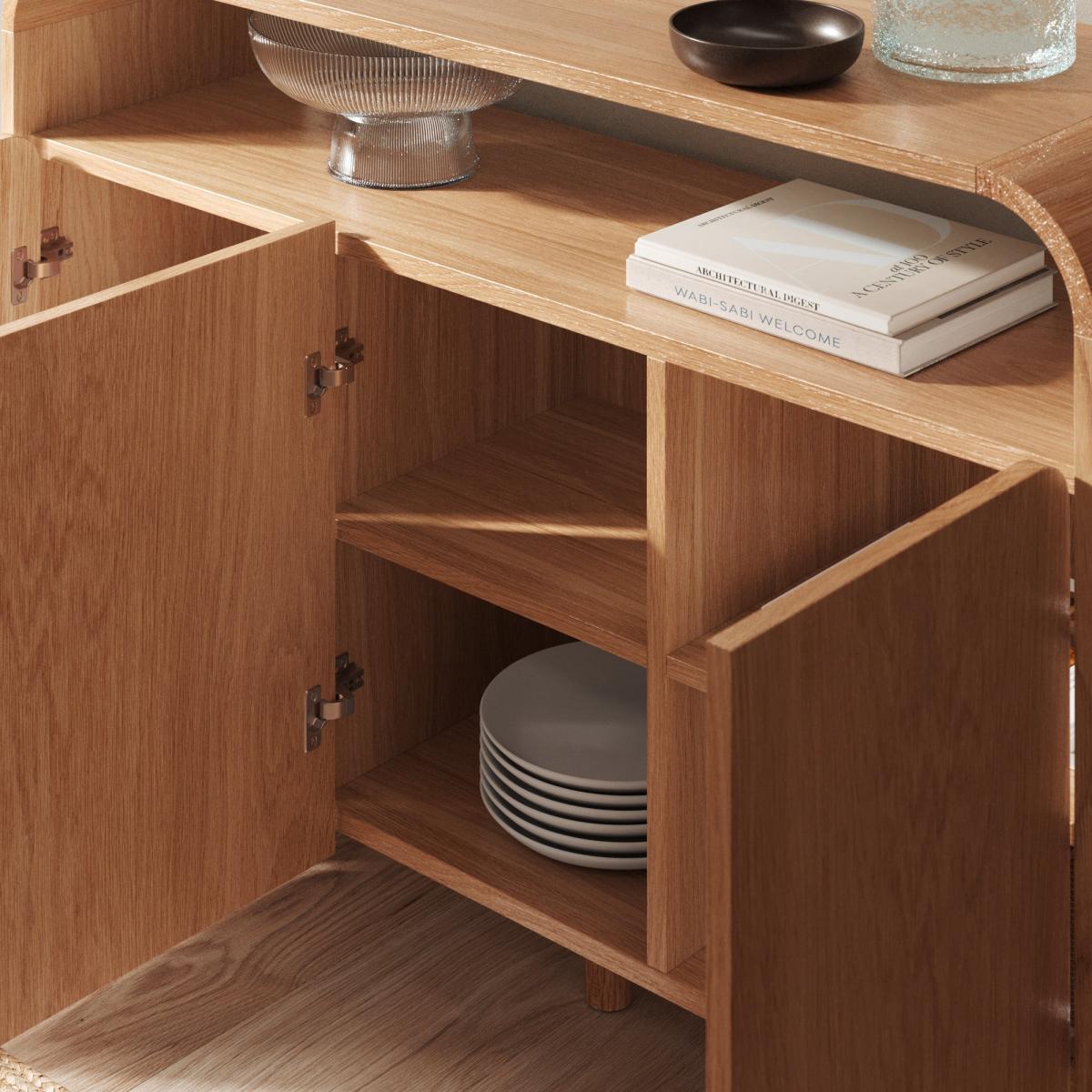 I’m a fan of the Bennett console for its clean lines, soft-rounded edges and light oak finish - it brings a warm, contemporary feel without dominating a space. The concealed cupboard and open shelf make it equally useful in an entrance hall (stashing shoes or post) or tucked behind a sofa in a living area. To style it, start with a medium-height mirror or piece of wall art centred above. On one side of the top surface, place a low-profile table lamp and on the other, a small stack of coffee-table books topped with a sculptural object or ceramic vase. Use a woven basket or box on the shelf for out-of-sight clutter and keep a slim tray on the doors for your daily essentials. Finish with a single branch or a small potted plant for a touch of greenery.