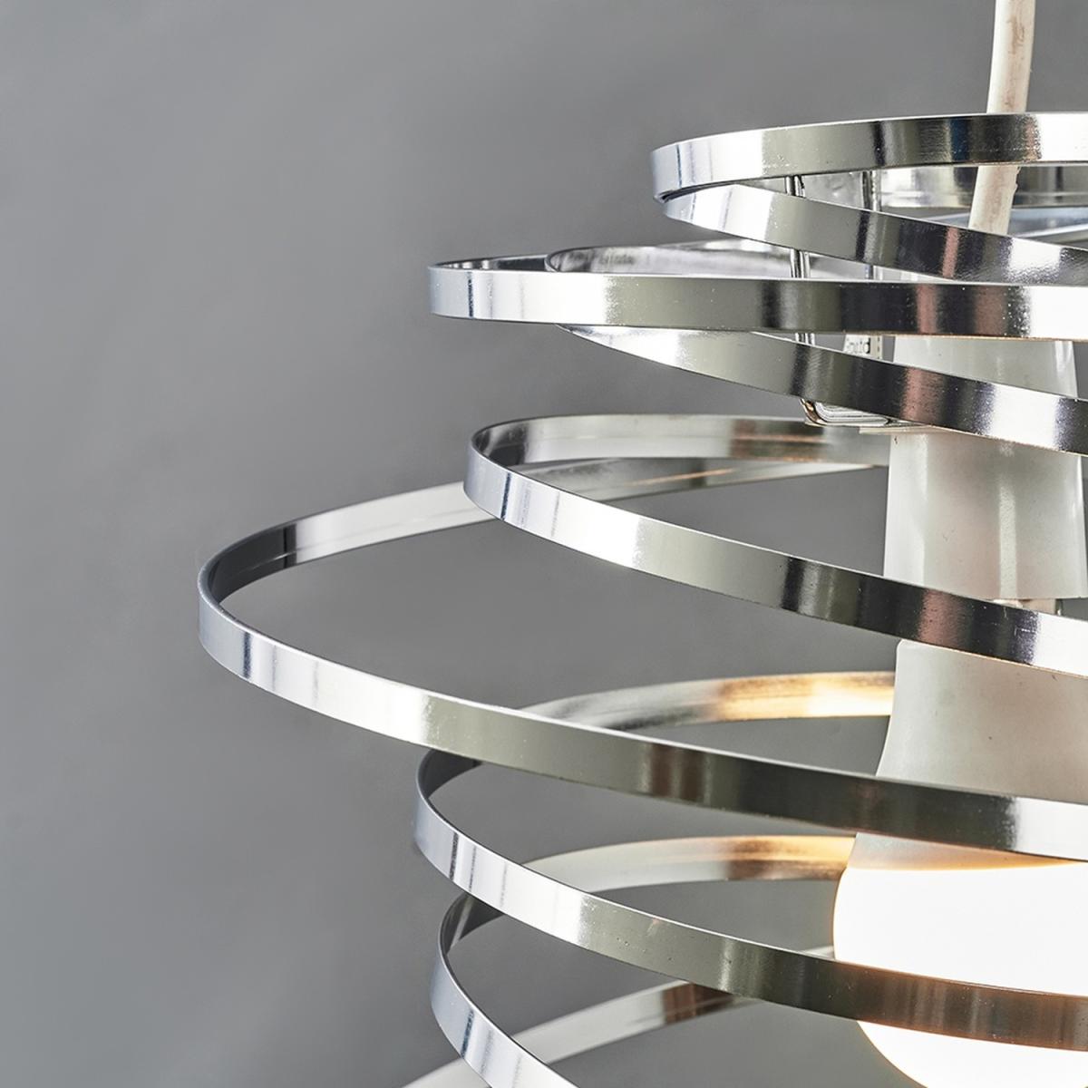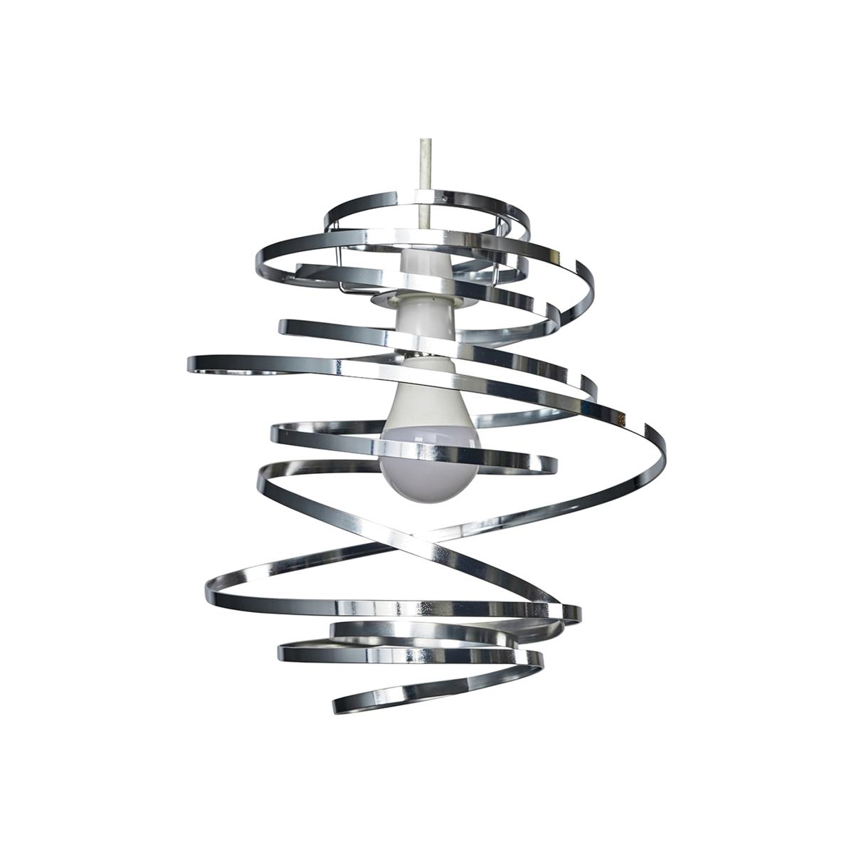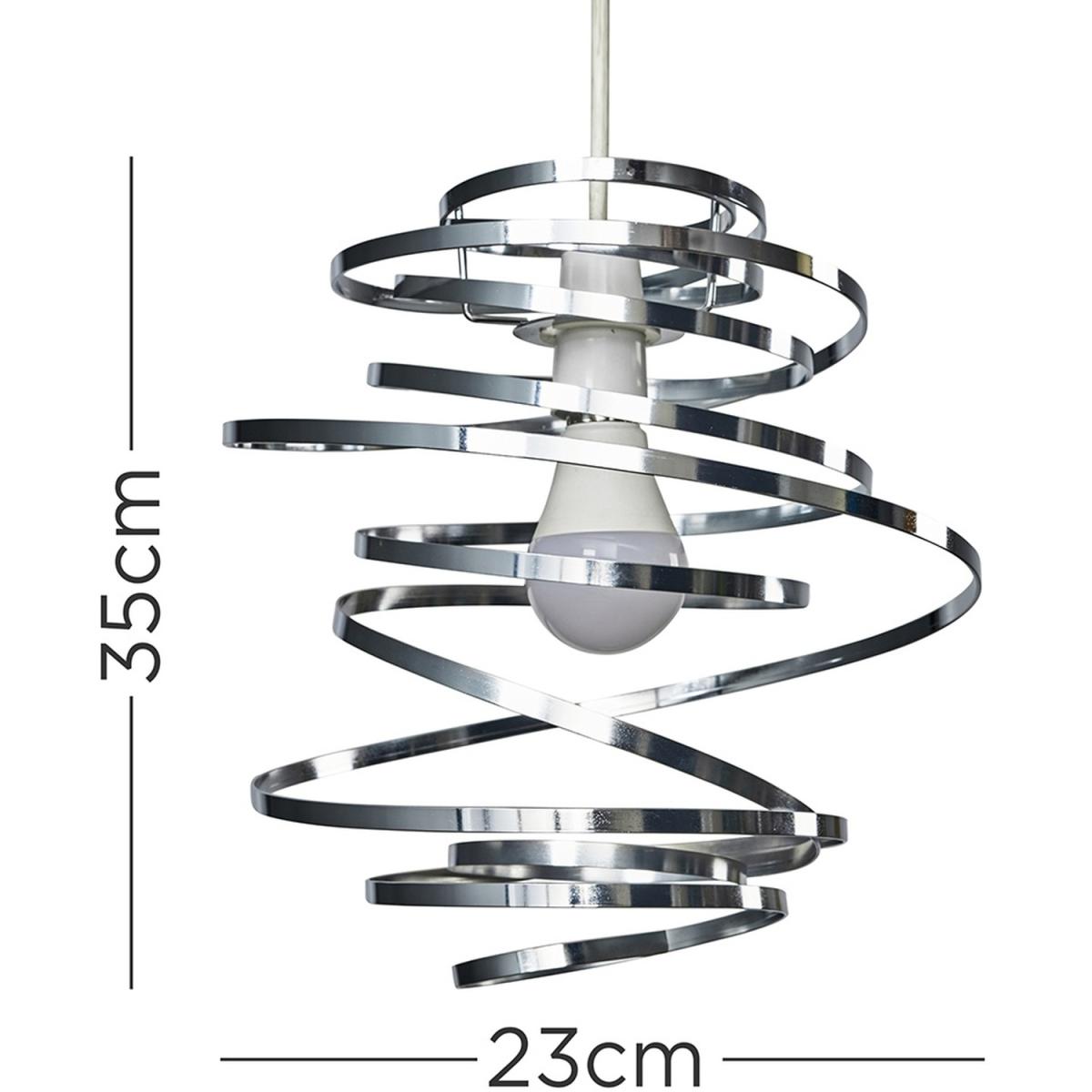 Designer style metal swirled ceiling pendant light shade in silver chrome finish. With a wonderful twisted dancing gymnastics ribbon spiral design. Ideal for lounges, dining rooms, bedrooms and hallways. Ceiling lights are usually the main source of illuminating a room but with the many styles on offer today, also become a main focal point or talking point. The right fitting can make a real style statement and complete your living space look. Easily fits to your existing light fitting. 1 x 60w BC B22 GLS Bulb Required - Not Supplied