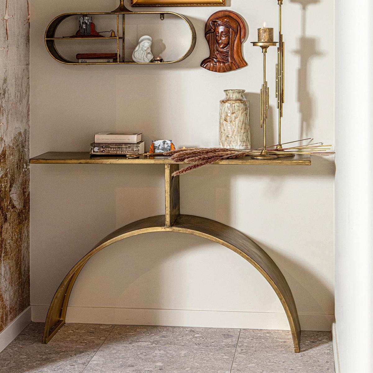 Introducing a stunning piece of home furniture, the Altar Metal Side Table from BePure. Home. Constructed from steel and finished in brass with the straight line and fun curved foot combination; this side table is sure to sprinkle some art deco character wherever you place it. The ideal amigo to your sofa or your favourite chair. Perfect to perch your morning cuppa, or that cheeky vino as the evening arrives. Why not pop a candle on top to create a mellow warm radiance.