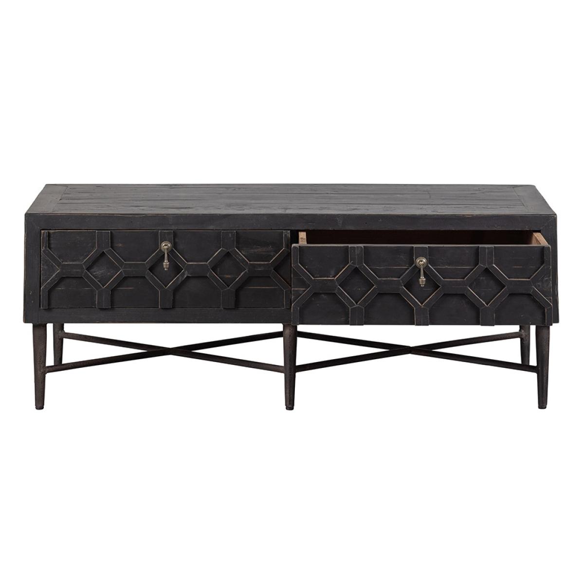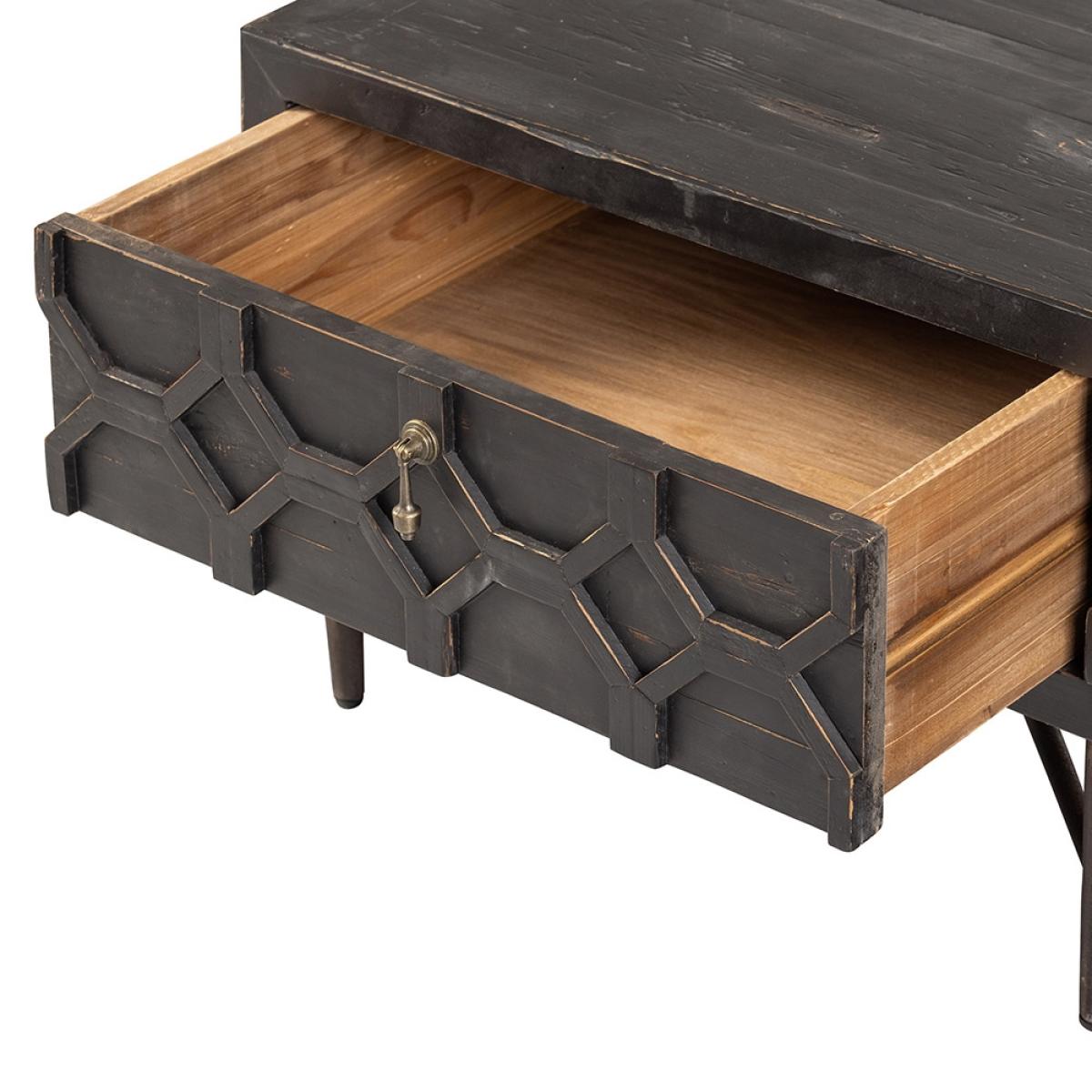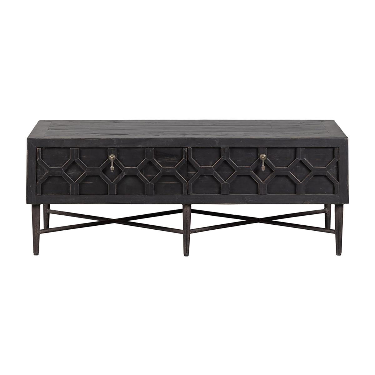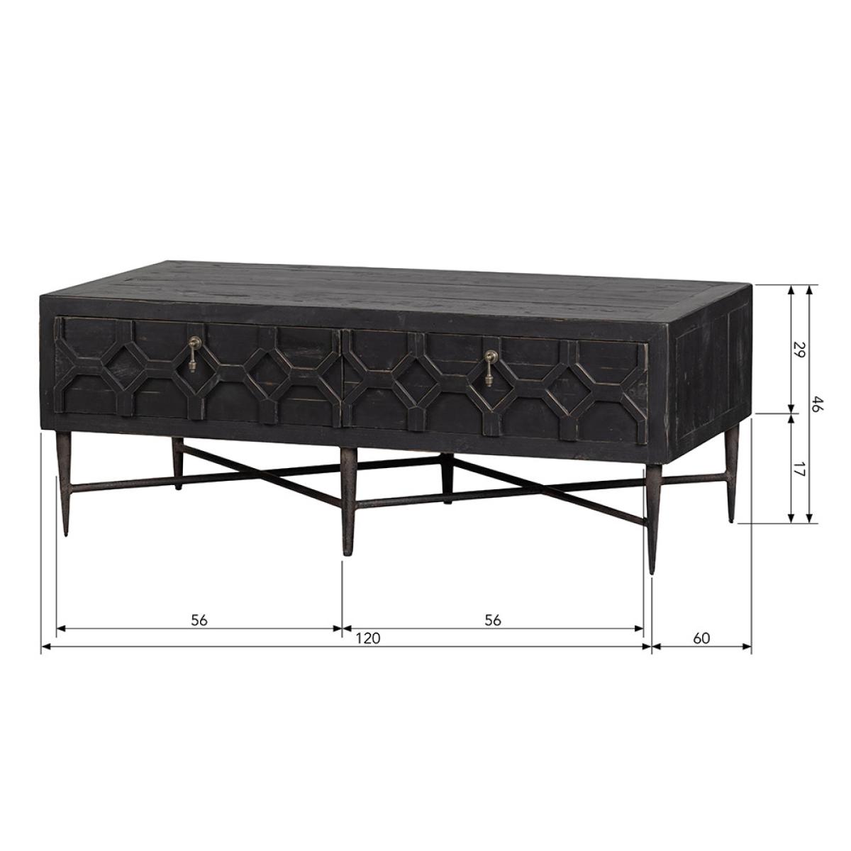 Part of the Bequest collection, completely transform your living room with this stunning table! The distressed nature and carved details of the BePure Home Bequest Coffee Table will give your space character and add interest to your coffee catchups and afternoon tea breaks. It's certainly a conversation starter! Manufactured from pine with a black antique finish, the two drawers feature a gorgeous decorative pattern whilst the iron legs have been given a dark rusty finish. With brass handle details and natural wood interiors, pair yours with matching accessories to complete the look! Imagine a couple of brass candlestick holders a matching vase and a storage tray on this beauty.