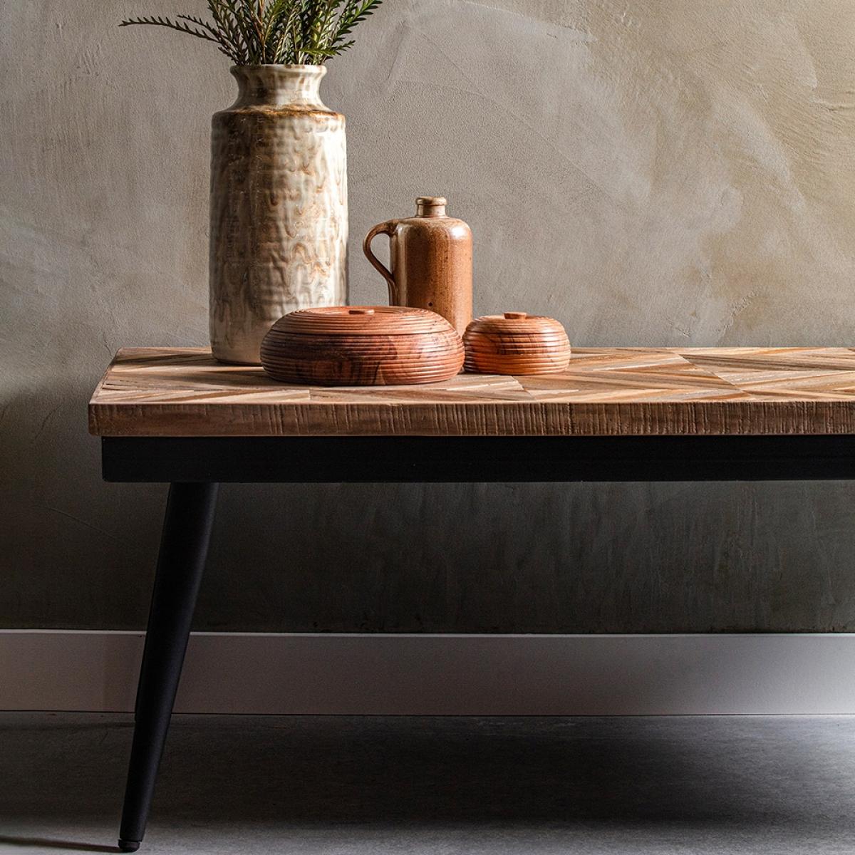 Looking for that special unique piece for your living room with some real character? The Rhombic Coffee Table by BePure Home ticks all the boxes. The tabletop is made from 100% recycled teak so no one piece will be the same. Sat atop sleek black iron legs, it's a real stunner! It will be the perfect place to pop that much needed cup of tea and maybe a few biscuits when you get home after a long day in the office. Why not finish off the look by adding a few personal touches, perhaps a coffee table book or two or maybe a vase of beautiful blooms. Features and Benefits:.