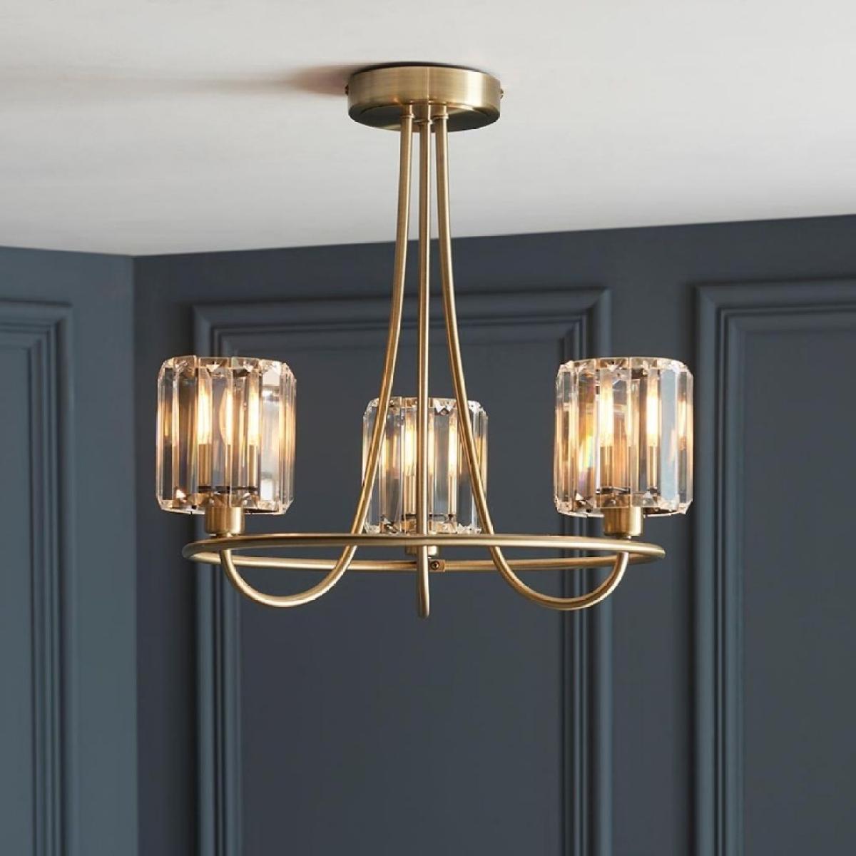 Berenice 3-light semi-flush ceiling light, featuring decorative clear cut faceted glass shades and an antique brass finish. A stunning fixture that blends vintage charm with contemporary elegance, this semi-flush ceiling light features three faceted glass shades, adding a touch of sophistication and glamour to any room. The antique brass finish enhances the fixture's timeless appeal, infusing your space with warmth and character. Ideal for bedrooms, hallways or living rooms, the Berenice ceiling light provides both ambient illumination and a stylish focal point for your decor. Its semi-flush mount design offers versatility, making it suitable for rooms with lower ceilings. Berenice 3-light semi-flush ceiling light, featuring decorative clear cut faceted glass shades and an antique brass finish. A stunning fixture that blends vintage charm with contemporary elegance, this semi-flush ceiling light features three faceted glass shades, adding a touch of sophistication and glamour to any room. The antique brass finish enhances the fixture's timeless appeal, infusing your space with warmth and character. Ideal for bedrooms, hallways or living rooms, the Berenice ceiling light provides both ambient illumination and a stylish focal point for your decor. Its semi-flush mount design offers versatility, making it suitable for rooms with lower ceilings.
