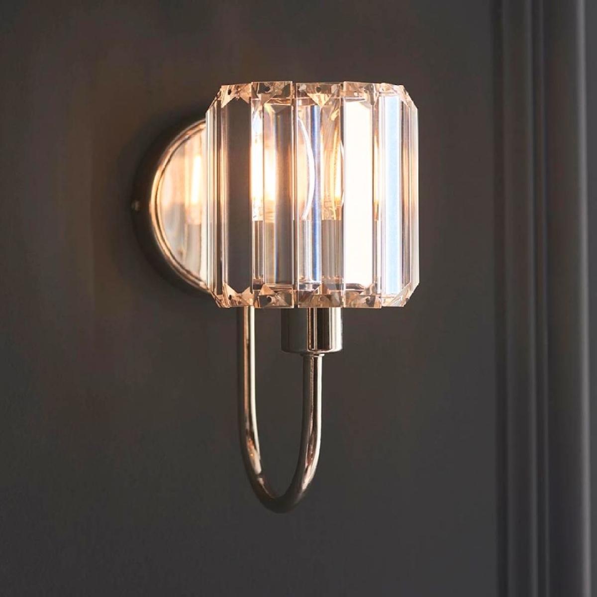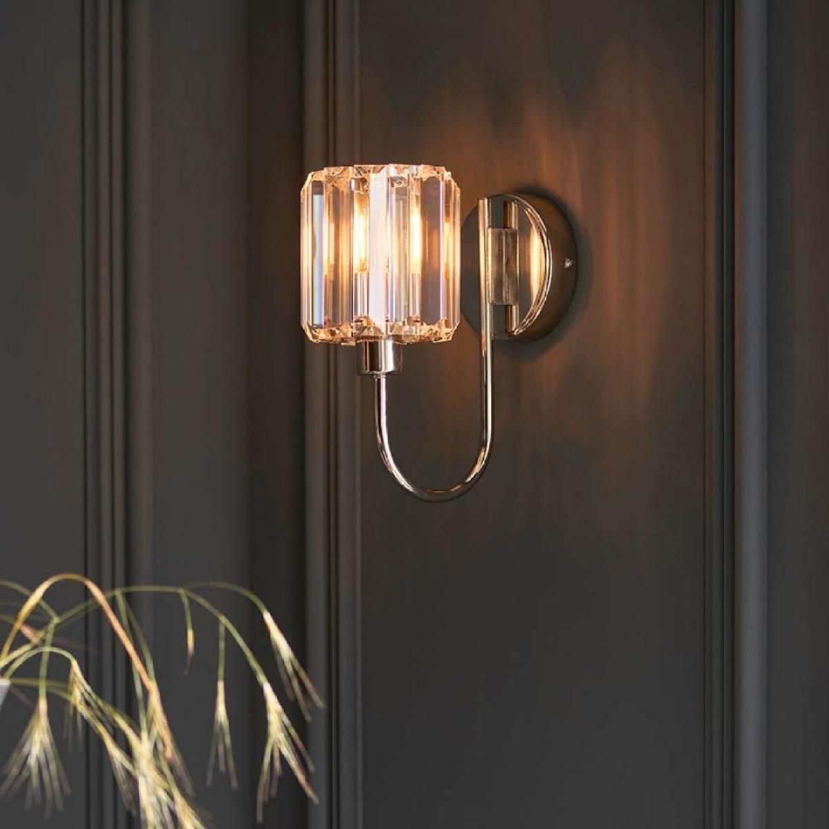 Berenice wall light with bright nickel finish and clear cut faceted glass shade. Elevate your interior with the timeless elegance of this exquisite lighting fixture, meticulously designed to add charm and sophistication to any space. The Berenice wall light features a classic nickel finish that exudes warmth and character, making it a perfect addition to traditional and contemporary settings alike. Its standout feature is the clear cut faceted glass shade, which adds a touch of glamour and visual interest to the design. Crafted with attention to detail and quality materials, this wall light not only serves as a stylish accent but also provides efficient illumination for your hallway, living room or bedroom. The elegant curved arm adds a sense of grace and refinement to the overall aesthetic. Whether you're looking to enhance your home's ambiance or add a touch of vintage charm to your decor, the Berenice wall light is the perfect choice. Berenice wall light with bright nickel finish and clear cut faceted glass shade. Elevate your interior with the timeless elegance of this exquisite lighting fixture, meticulously designed to add charm and sophistication to any space. The Berenice wall light features a classic nickel finish that exudes warmth and character, making it a perfect addition to traditional and contemporary settings alike. Its standout feature is the clear cut faceted glass shade, which adds a touch of glamour and visual interest to the design. Crafted with attention to detail and quality materials, this wall light not only serves as a stylish accent but also provides efficient illumination for your hallway, living room or bedroom. The elegant curved arm adds a sense of grace and refinement to the overall aesthetic. Whether you're looking to enhance your home's ambiance or add a touch of vintage charm to your decor, the Berenice wall light is the perfect choice.
